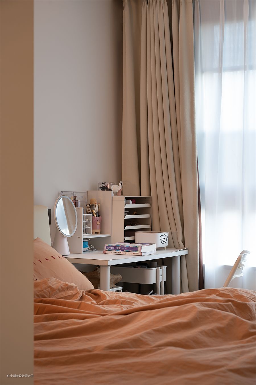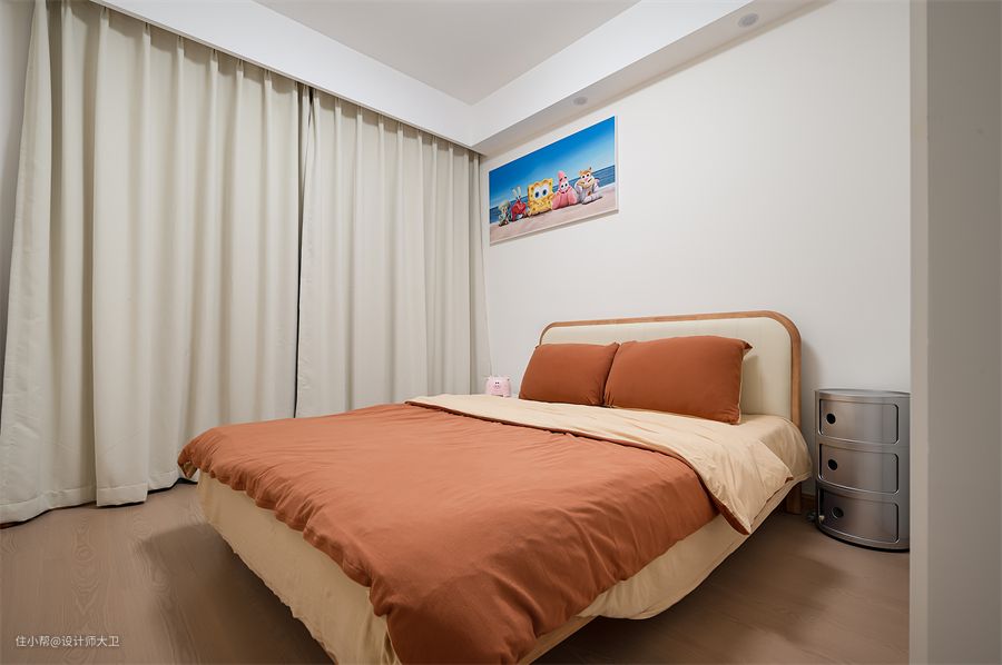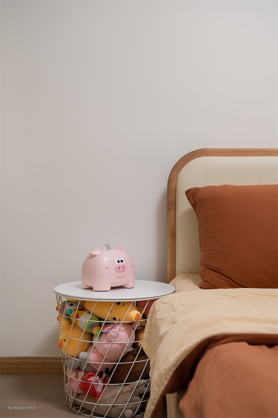 次卧做儿童房使用,大白墙搭配装饰画,营造简单舒适的休息空间,床和床品也延用了米橙色系,比较清新活泼。床头桌既有收纳也有置物功能,里面堆满了孩子喜欢的公仔