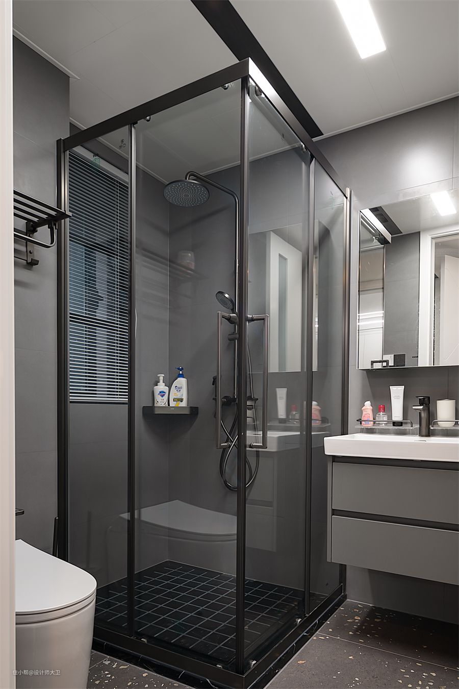 卫生间也设计了深色系的,因为他们经常跑步骑车,身心比较燥热,所以需要冷静的地方,卫生间冲澡是业主经常的事,所以卫生间采用了深灰冷色系的,这样能更好的调节阴阳平衡