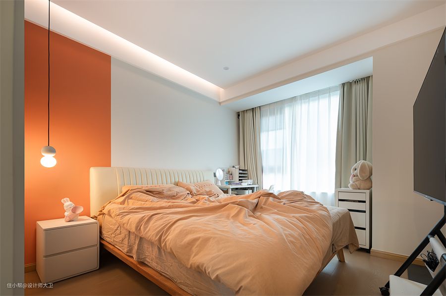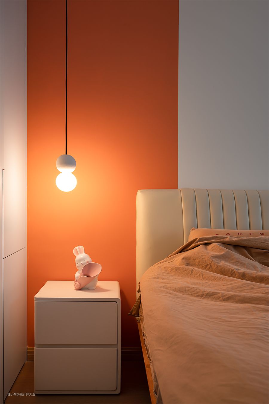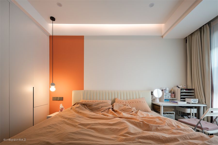 卧室不喜欢复杂的花色,更喜欢乳胶漆的感觉,所以背景墙用了白色拼橘色,整体增加明亮的色调,衣柜、床和床头柜也是白色系,灯光做了无主灯设计,隐藏灯带+床头小吊灯,营造日常氛围光源