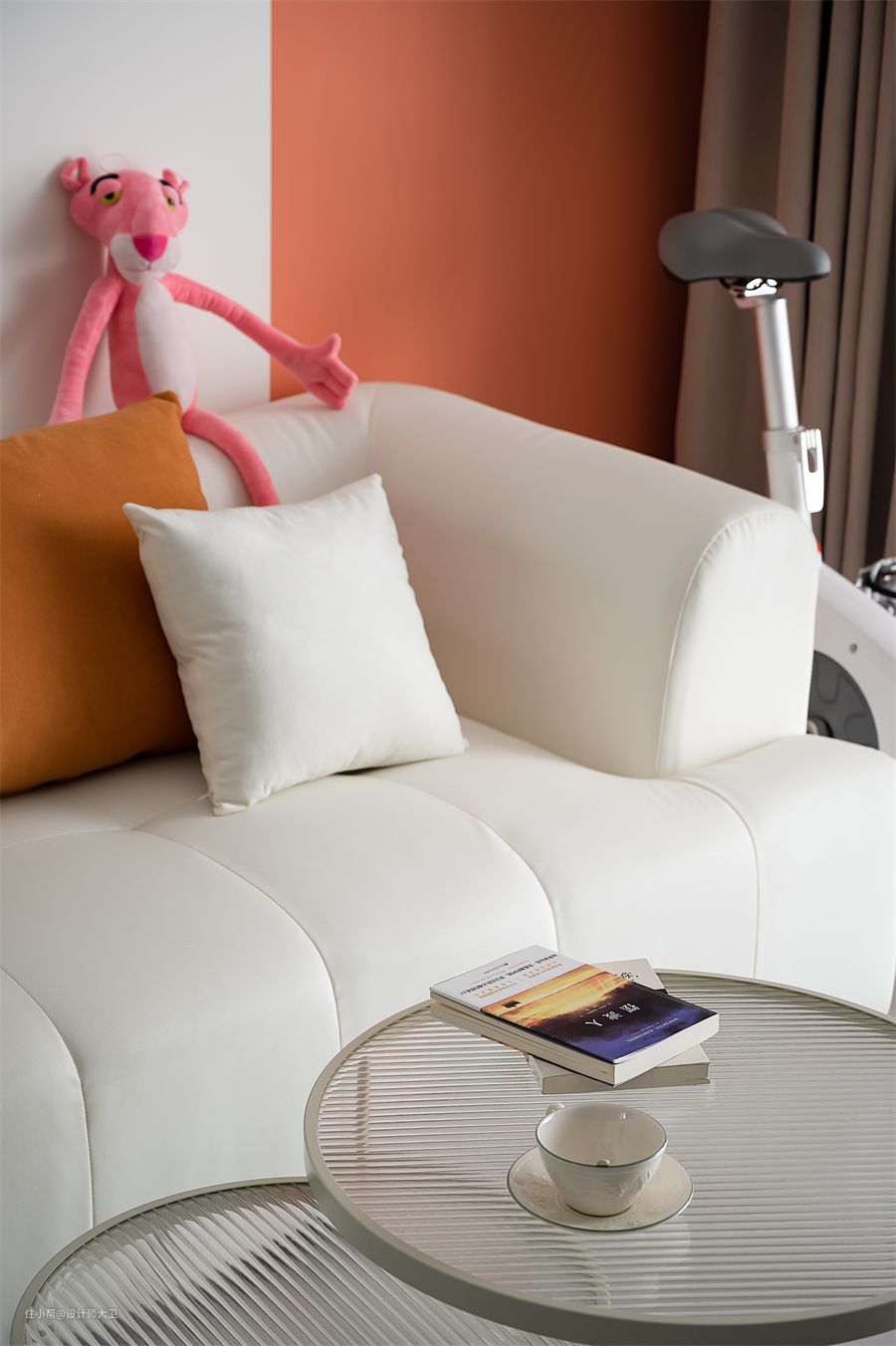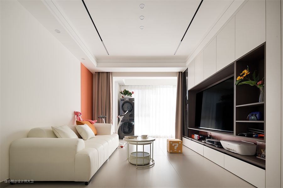 客厅是女屋主喜欢的奶油风,而且女屋主也比较个性,想要跳跃感,同时奶油风又比较暖白,所以沙发背景采用了艳丽的颜色作为局部的跳色,来增加整体空间感的活跃,米白色沙发和哑光地砖又是奶油风的标配,两者相融搭配的很协调 女业主喜欢嵌入式电视以及满墙的柜子的充实感,故又设计了电视背景的满墙电视柜,旁边隐形门,又增加了整面柜子的感觉,日常收纳和展示功能兼具