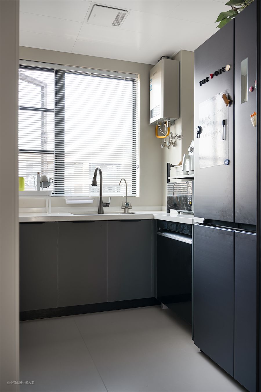 厨房做了小小的U型设计,橱柜也是偏深灰色,冰箱也选了灰色系的款式,整体色调很搭配。厨房电器选用黑色,墙砖用了白色系,不同色彩的组合,让空间更有层次质感