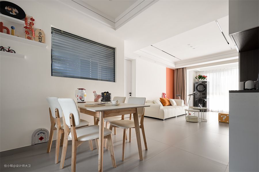 餐厅旁是主卧,这里能看到提前预留出的猫洞,方便猫猫进出。餐桌椅选了原木+白色的搭配,会更显小清新,整体色调也偏浅色系