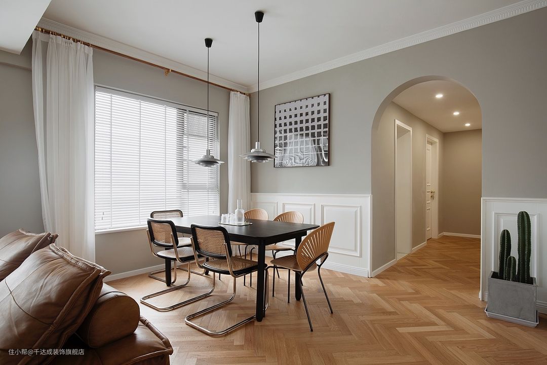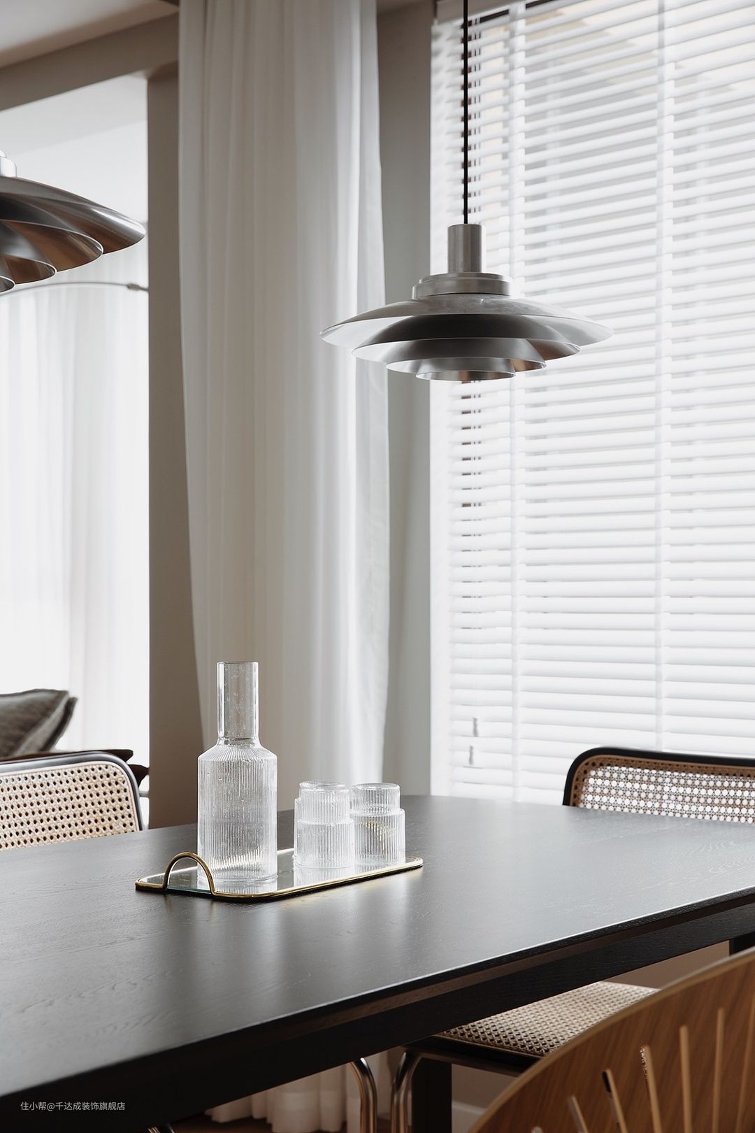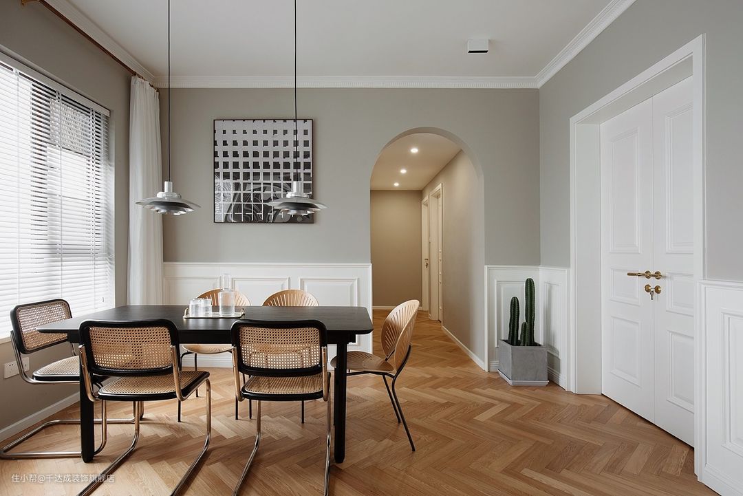 黑色餐桌和白色墙面的对比使整个设计显得现代且简洁。黑色餐桌与白色吊灯形成鲜明的对比,增强了设计的层次感。白色吊灯的设计时尚,它既能为用餐区域提供足够的光线,同时也是整个设计的视觉焦点。其独特的造型与餐桌、椅子的简洁风格形成了互补。