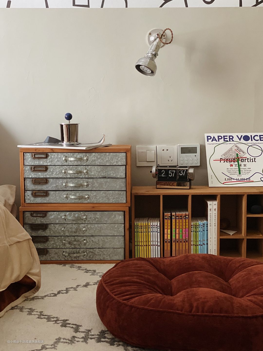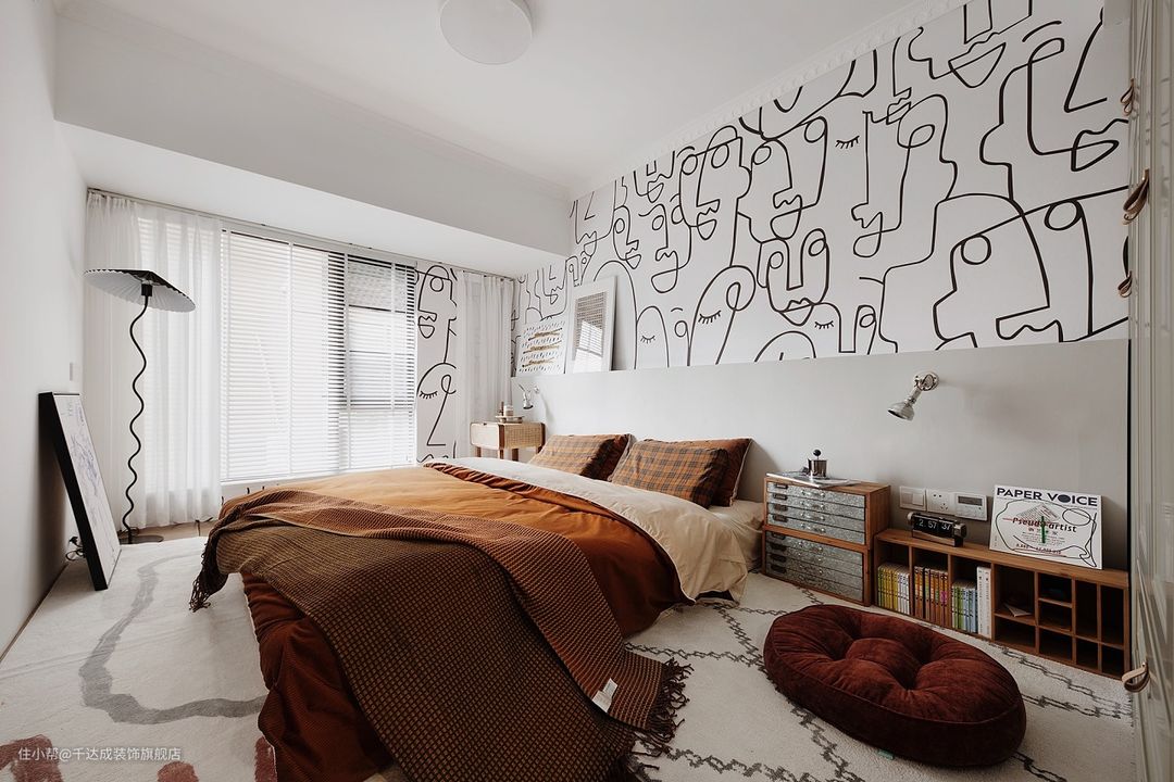 房间整体的色调以白色为主,百叶窗的设计可以通过调节叶片的角度,从而控制光线的射入,实现多元化光线需求,营造出柔和或冷酷的多种光影视觉效果。墙上的壁画,为整个房间增添了一份艺术气息。这样的设计不仅可以作为装饰,也可以体现出居住者的个性和品味。