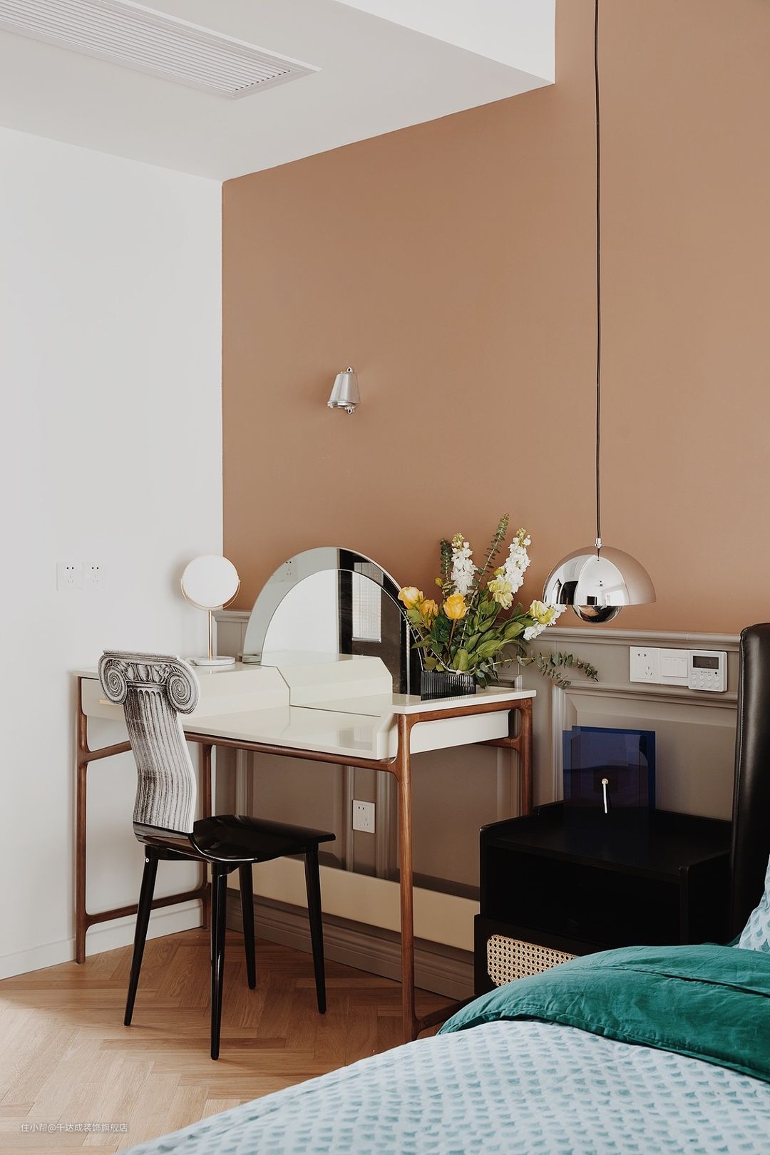 配色方案以暖色调为主,通过木质家具、浅黄色墙壁和点缀色等元素营造出一个舒适、温馨、自然的休息空间。这种配色方案有助于放松身心,为人们提供一个宁静的休息场所。床头柜的一边设计了一个独立的化妆桌,为女主人提供了一个独立且较为大的化妆空间。阳台做了全落地的方案,增加了整个空间的采光。