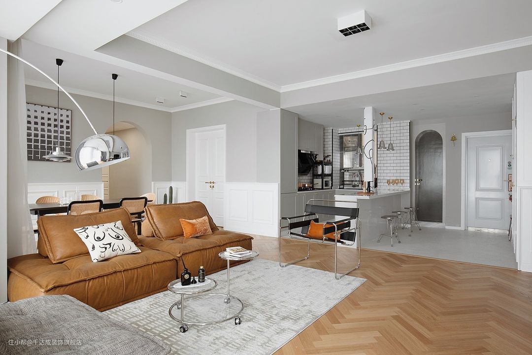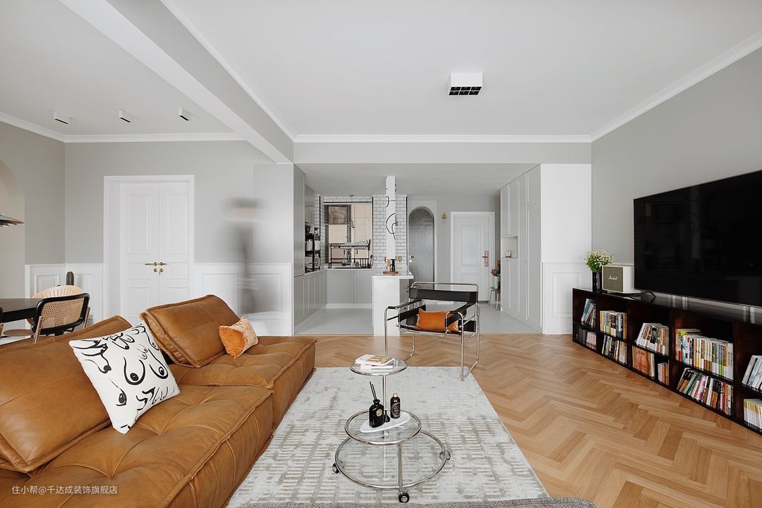 设计亮点在于沙发的颜色与整个空间的色调非常协调,突出了整体感。同时,木质地板和白色墙壁的搭配,营造出一种温馨舒适的氛围。
