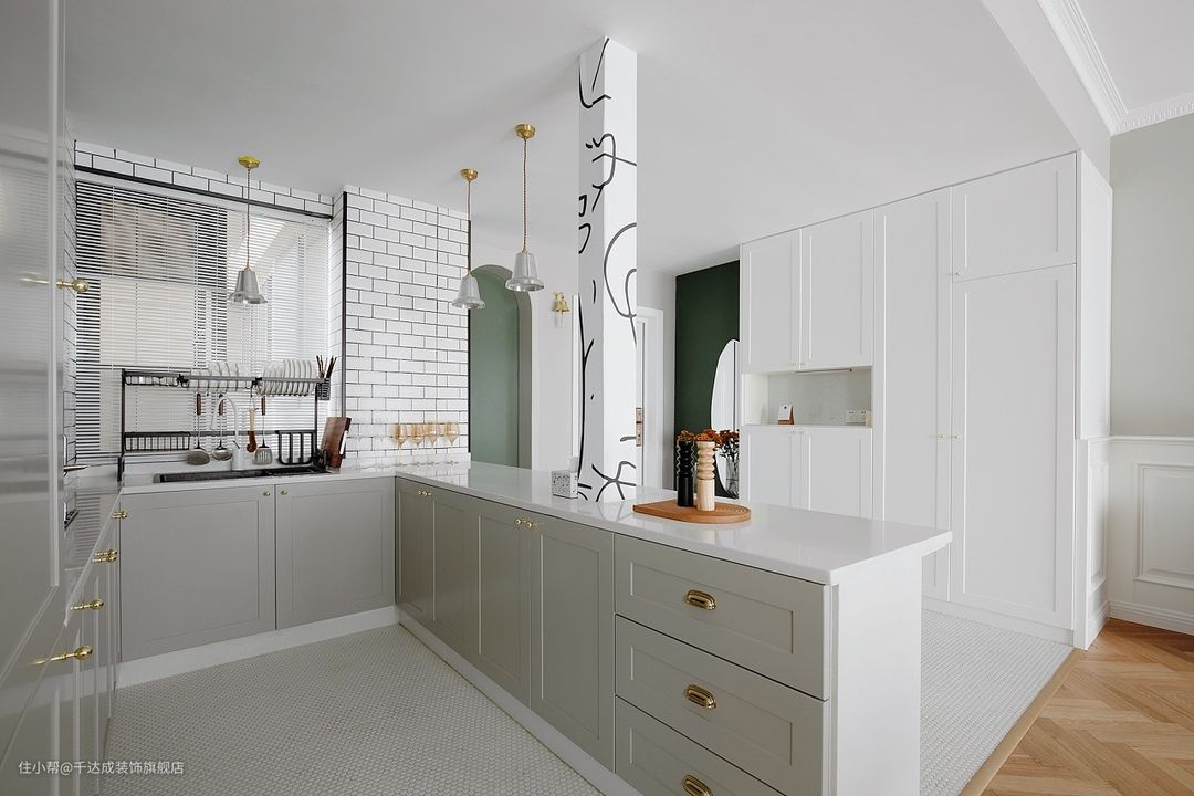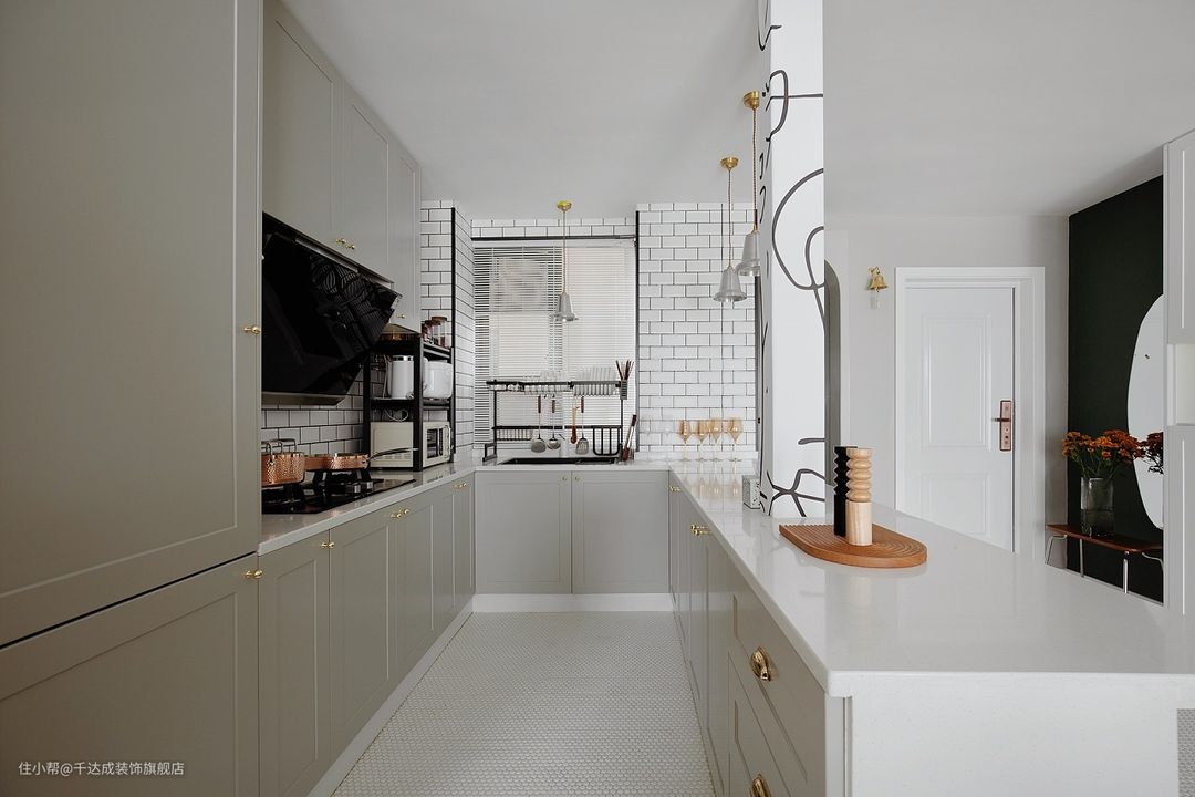 柜体的设计考虑到了收纳功能,使得厨房用品能够整齐地摆放,保持厨房的整洁。同时,柜门上的金色把手为整个厨房增添了一抹亮色,使得原本简洁的黑白配色更加生动、有质感。金色的把手也具有一定的奢华感,提升了整个厨房的档次。