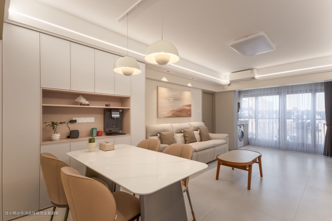 延续客厅的奶油色调,餐厅同样选择温柔清新的配色,在白色的餐边柜中加入奶咖色,丰富空间层次感,纯粹又不失温暖,让整个空间被温暖和治愈的氛围所包裹。