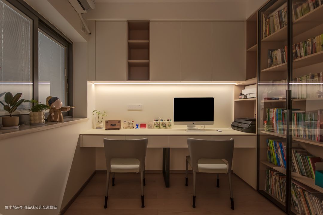 玄关增设鞋帽间后,将靠近入户大门的卧室改造为书房,一字型的悬浮式书桌合理利用空间,提供宽敞舒适的学习、工作环境。 靠墙的一侧做了大书柜,将全家的书籍整齐收纳。玻璃柜门不仅可以防尘,更好地保存书籍,也可以增加空间的通透感。