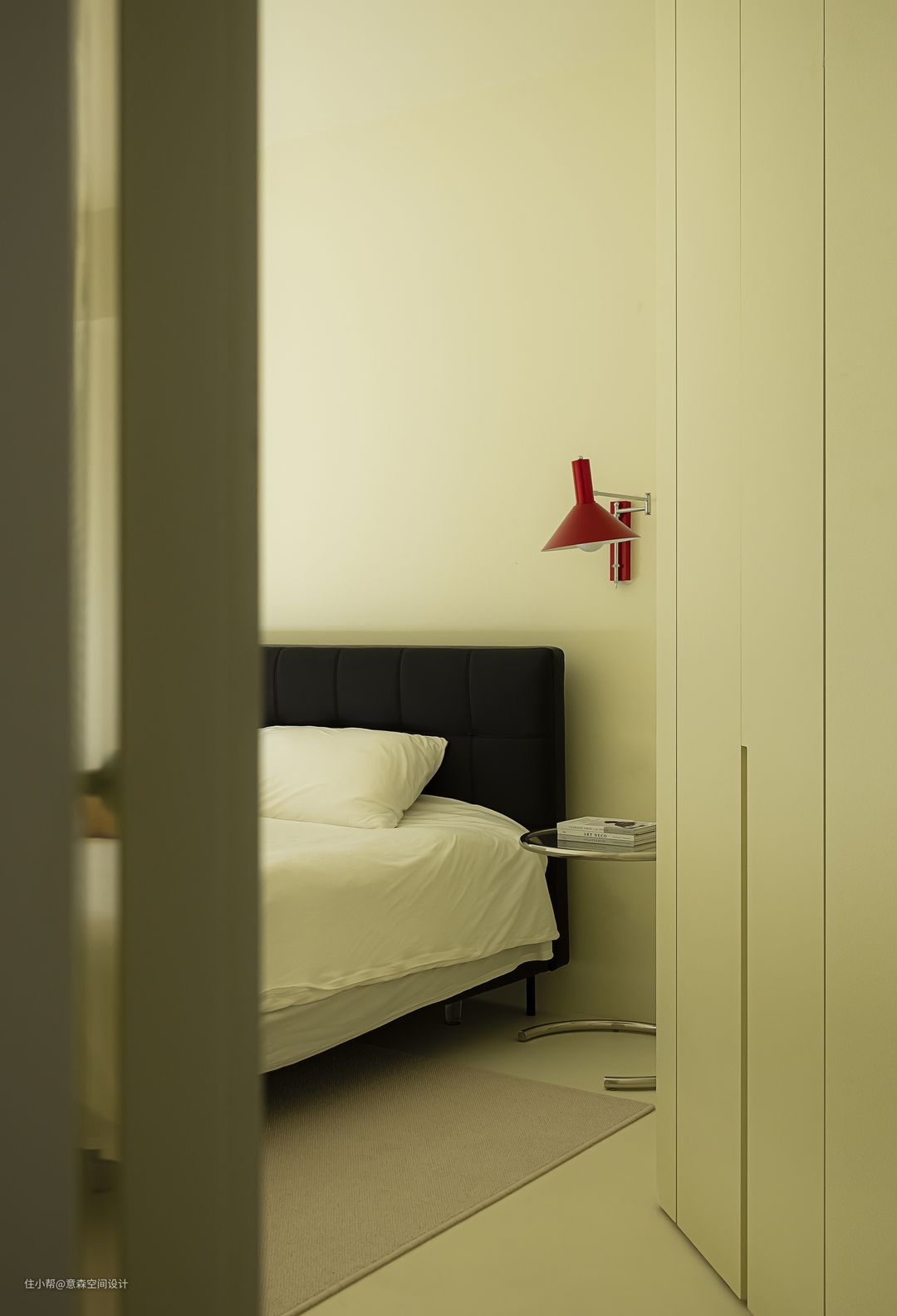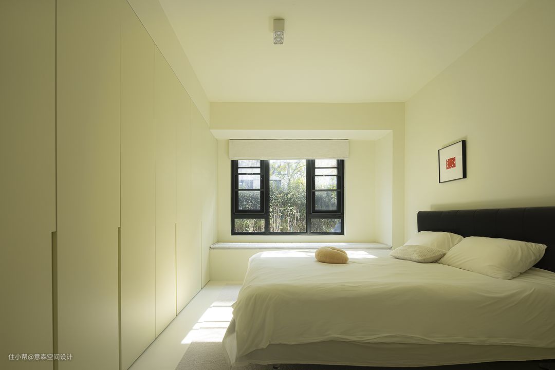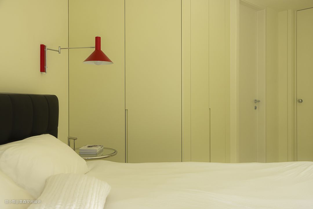 主卧在调整了门洞角度以后自然形成了一个内凹空间 这个空间除了安排了隐藏收纳外 也是一个端景 入户之后目之所及有美景 主卧没有做大的调整 而是在精装基础上增加了收纳体系 沿用的仍是公区的微水泥,柜门板按微水泥的色号进行烤漆处理,以达到视觉的统一性 沿墙两大组收纳柜足以收纳日常衣物及换季物品 主卧配套卫生间,便于小夫妻及小朋友日常使用