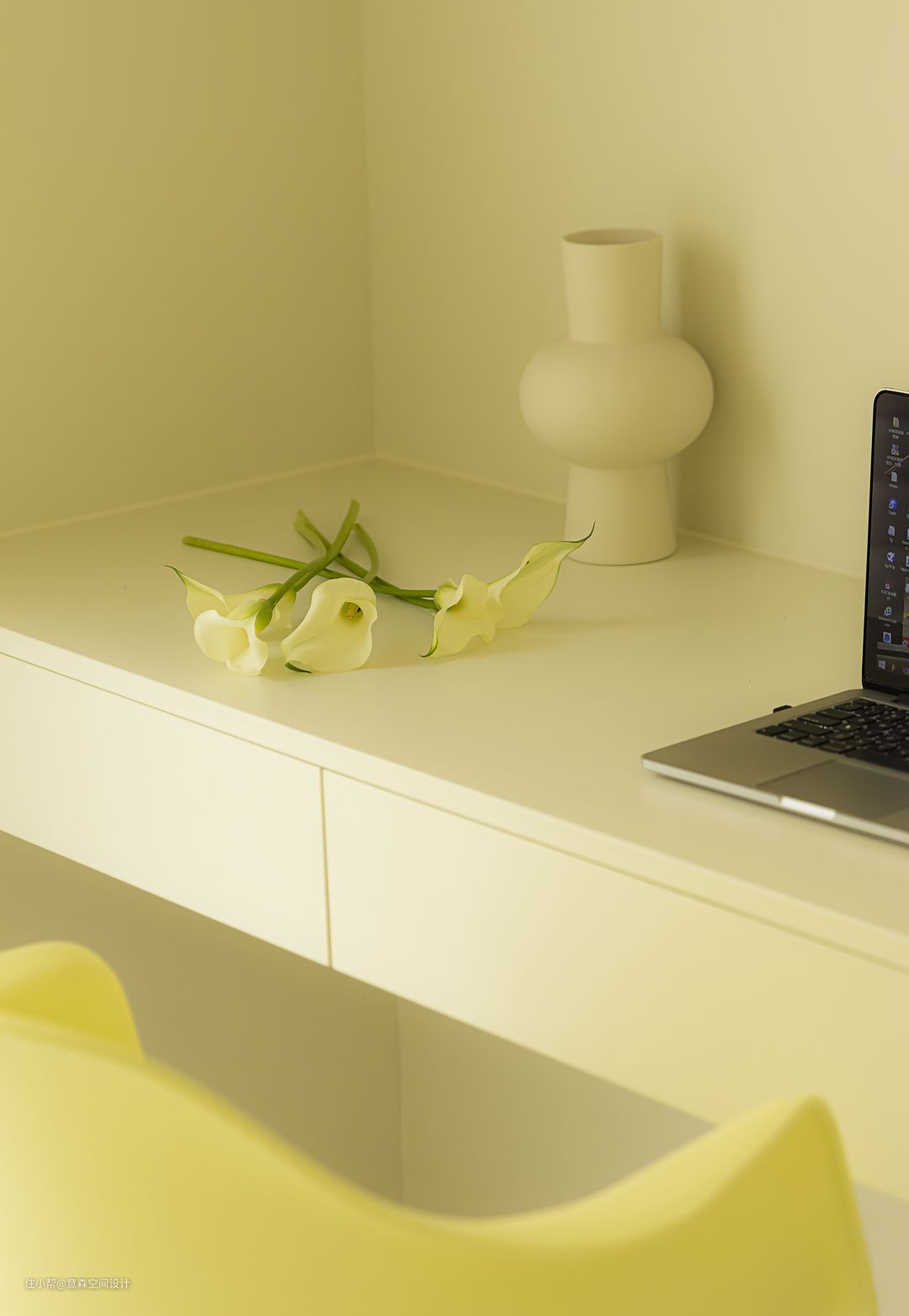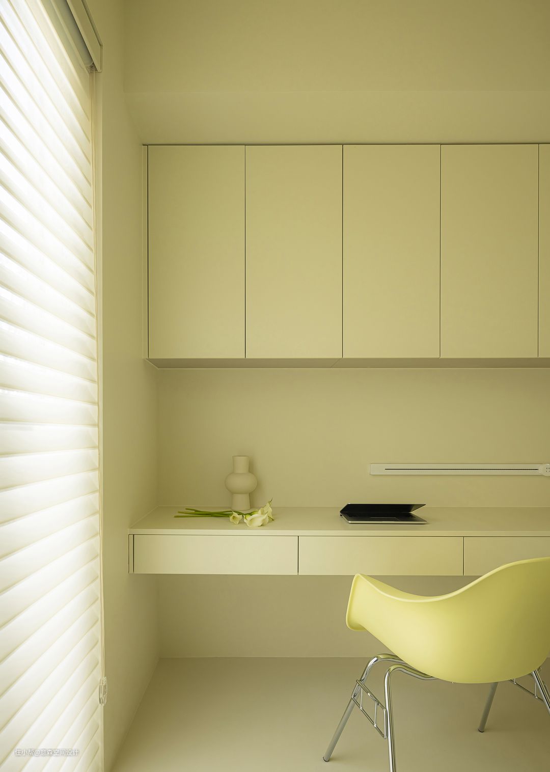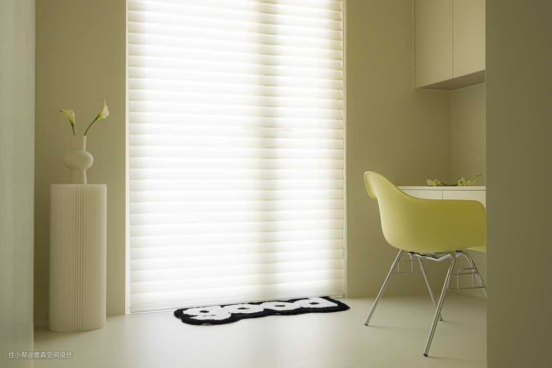 书房挨着餐厅 玻璃移门作为隔断,隐私性十足却不闭塞 自然光穿透引入餐厅空间,为餐厅补充光源 大长桌的写字台,可以满足2人同时办公 顶面吊柜和写字台抽屉满足日常藏书或者设备存放 万一有客来访需要住下也是一个可利用的空间