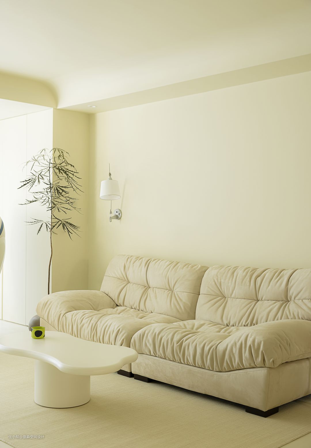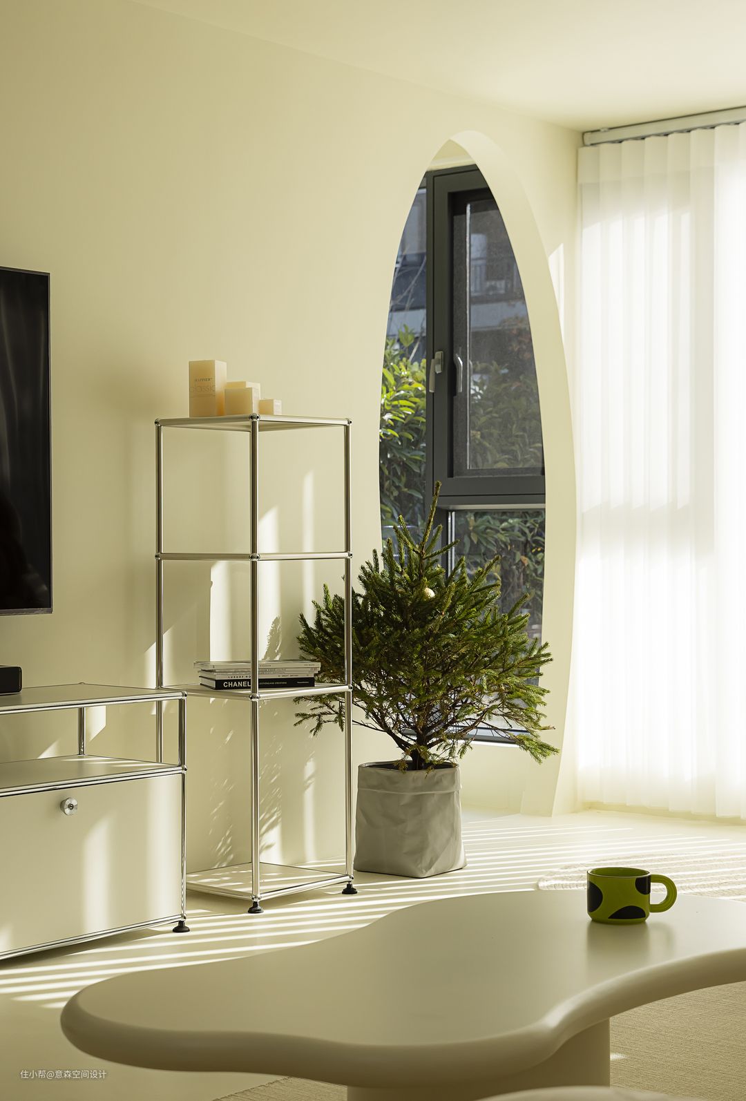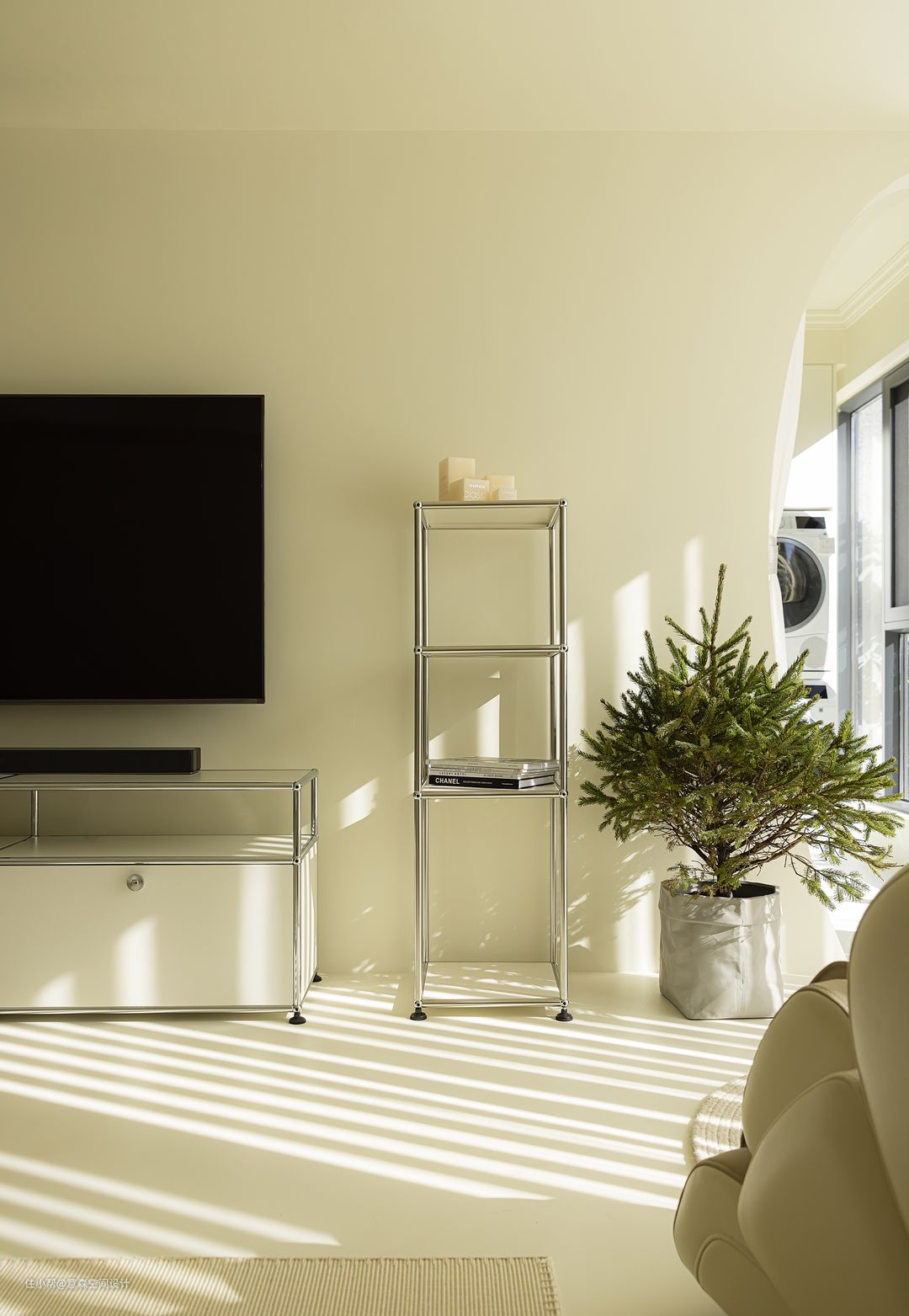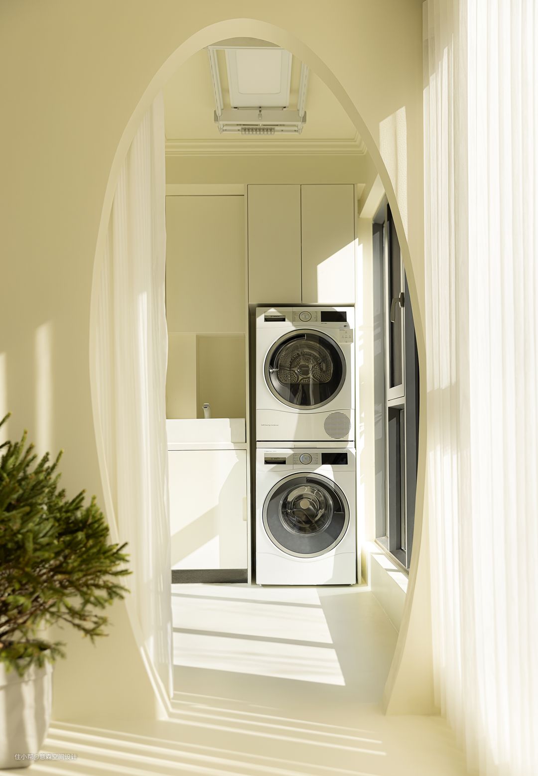 与客厅连接的阳台纳入了室内,但仍保留了生活阳台 斜斜的鸭蛋型门洞给生活阳台的入口增加趣味性,也算是客厅造型的一笔 生活阳台一应俱全,晾晒衣物以后还可以将门洞的门帘拉上,营造更美观的视觉效果