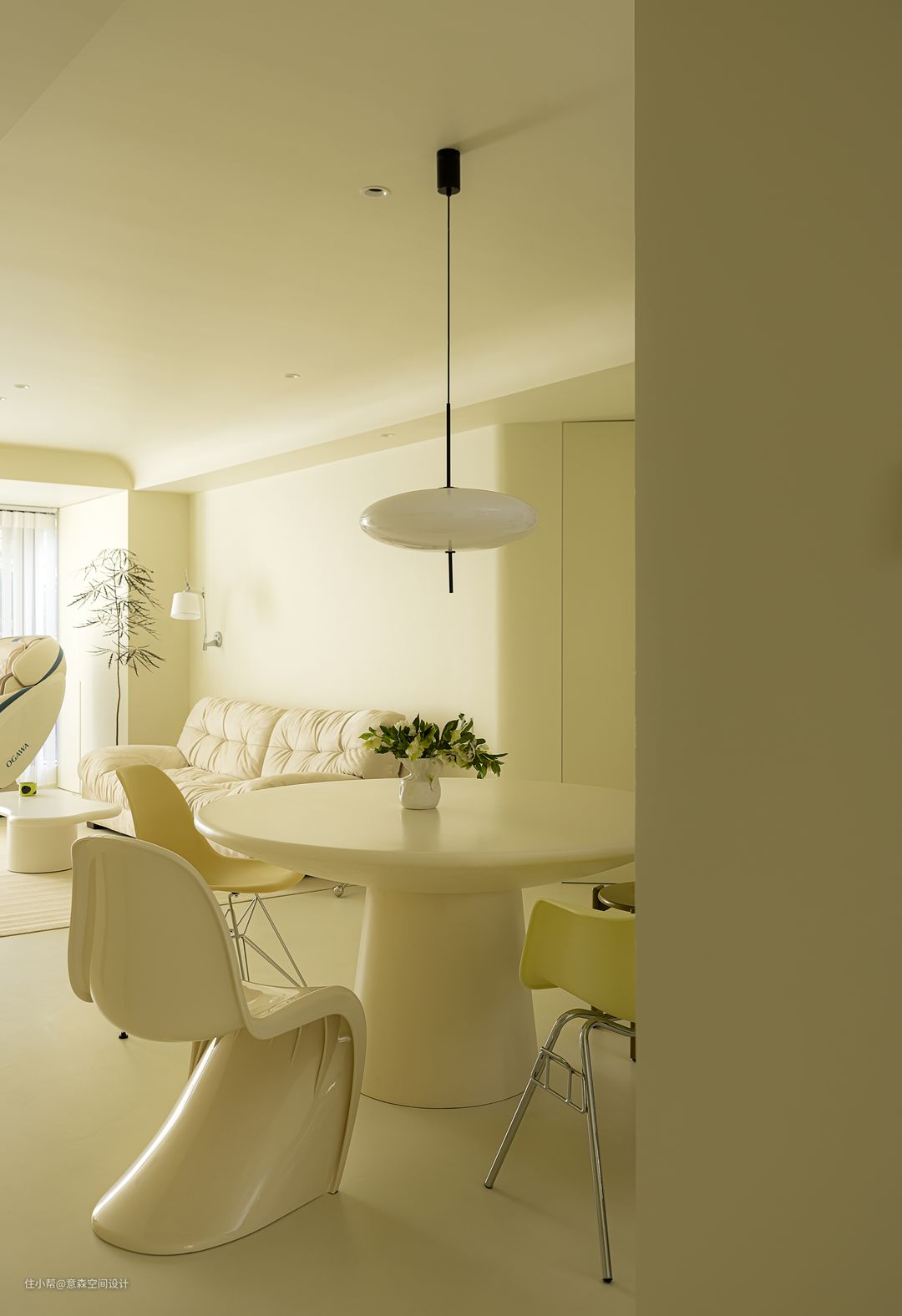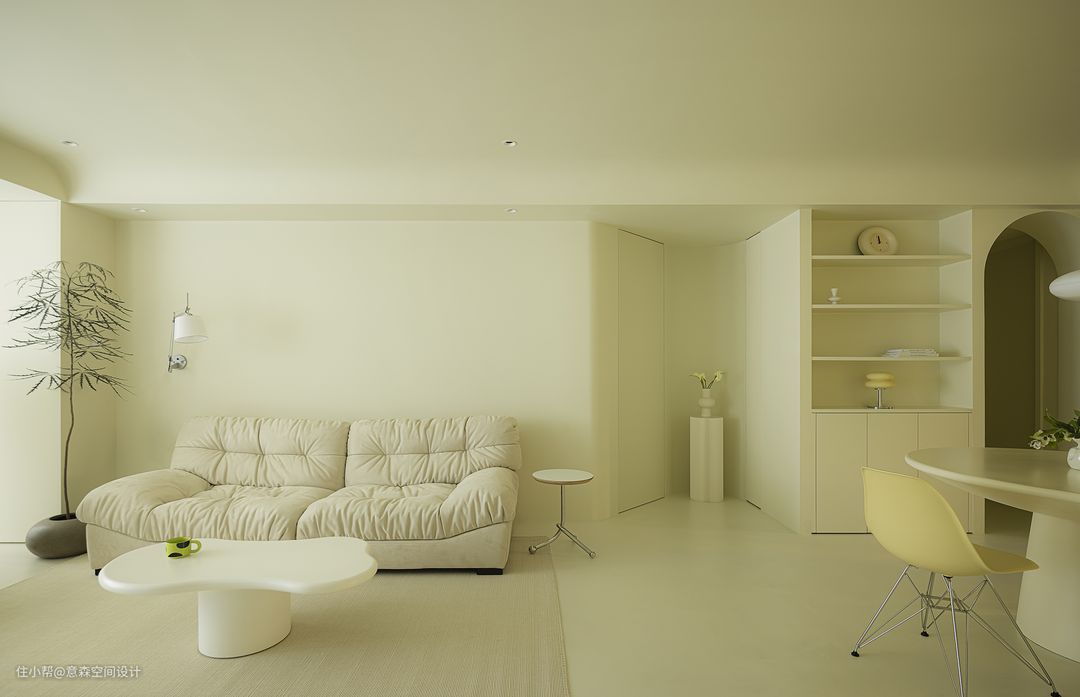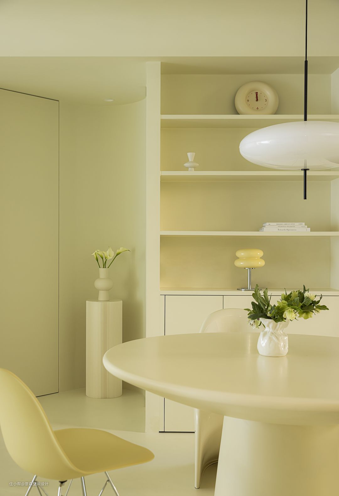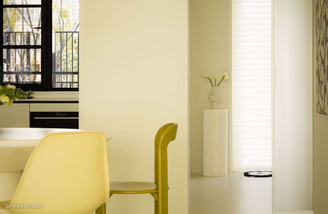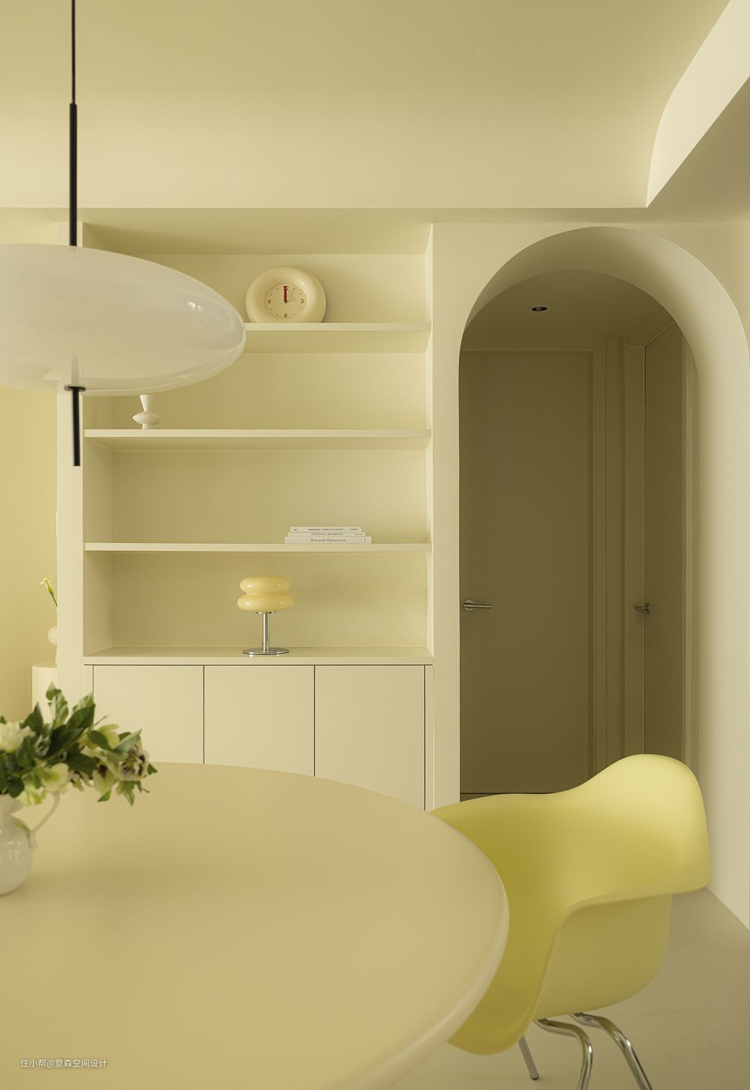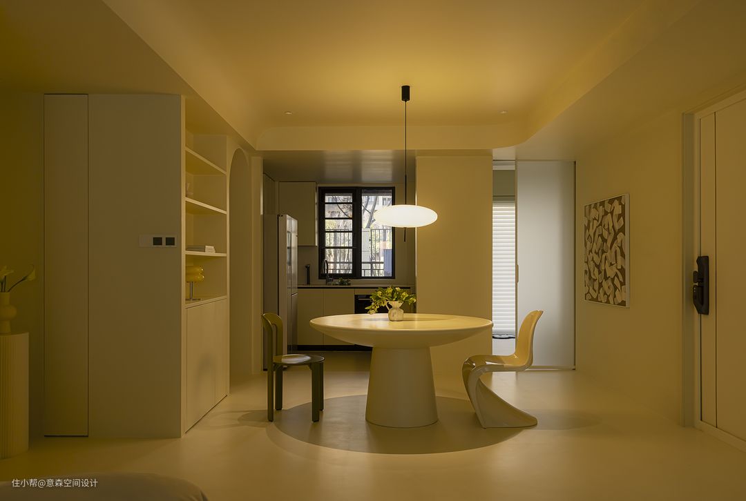 餐厅更多营造是围合感和亲密感 圆形餐桌和带有各种“圆”元素的餐椅 家具与硬装自然融洽 借用了部分客卫空间的餐边柜 与餐桌搭配的天衣无缝 开放式置物架和收纳柜相辅相成,完美收纳餐厅所需
