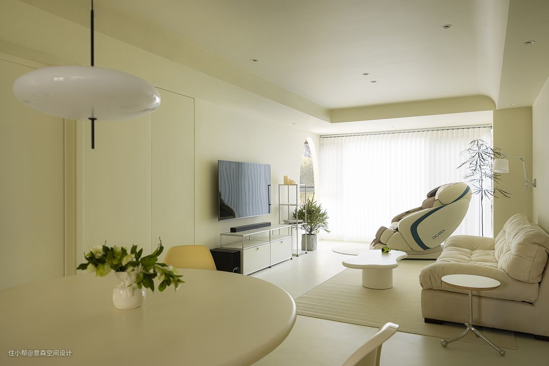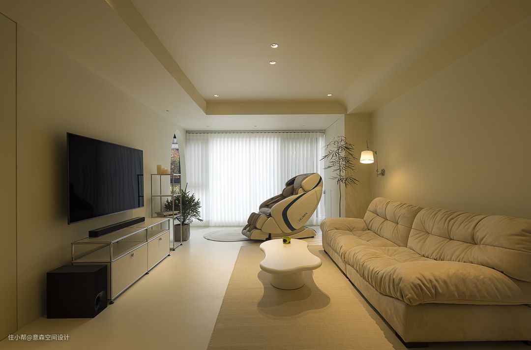 入户首先进入视野的就是横贯的客餐厅 电视背景墙及沙发背景墙都是极简的风格 没有过多的装饰 电视背景墙与老人房共享一堵墙,精简了墙面收纳,用一组成品收纳柜代替 电视直接上墙,墙面微水泥肌理分明 沙发背景墙同样微水泥打底 配以科技布沙发,与壁灯、地毯、茶几组合成温润十足的亲子空间 原阳台隔断拆除后剩下的墙体刚好是一组收纳柜的深度,延伸至落地窗前 极简干净的客厅哪怕放上一个体型颇大的按摩椅都清清爽爽,满足身心愉悦感