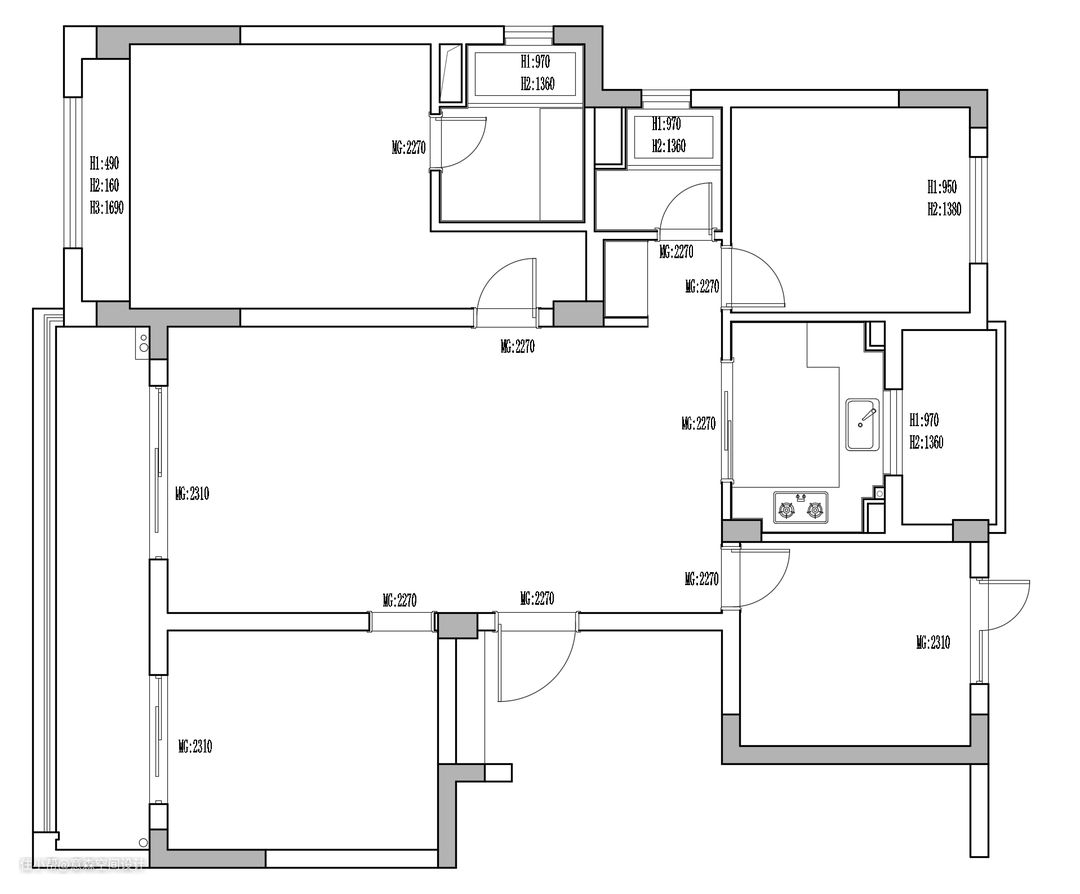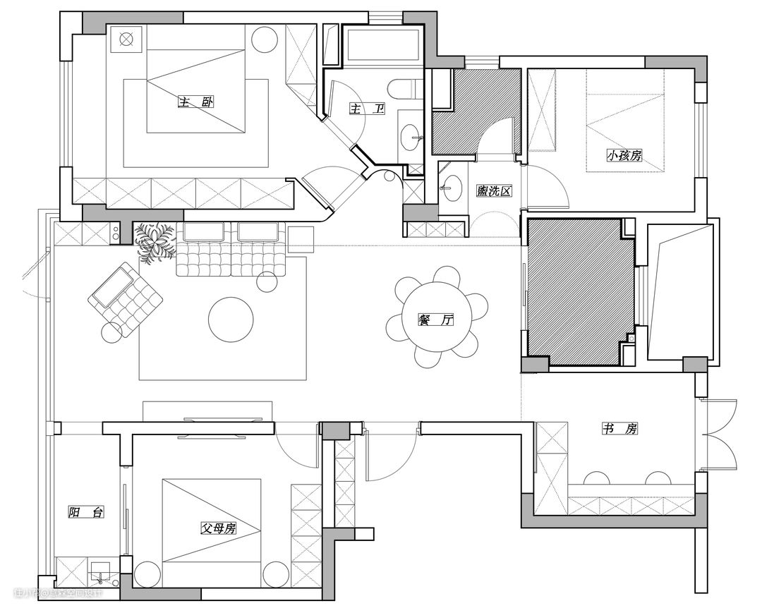 精装修交付户型 1.入户门正对主卧门,于风水和隐私性都不好 2.客厅虽方正,但小,无法满足三代同堂天伦空间的需求 3.餐厅夹在客厅和厨房中间,还需要给通往主卧和儿童房留出过道 改造方案 1.入户门无法调整,那就把主卧门调整方向,利用角度的视觉差打造主卧隐私性 2.拆除阳台门将阳台收入囊中,扩大客厅空间,客厅中心往阳台移动,提升客厅舒适性 3.餐厅采用了圆桌,增加违和感的同时还给主卧和儿童房提供了便利