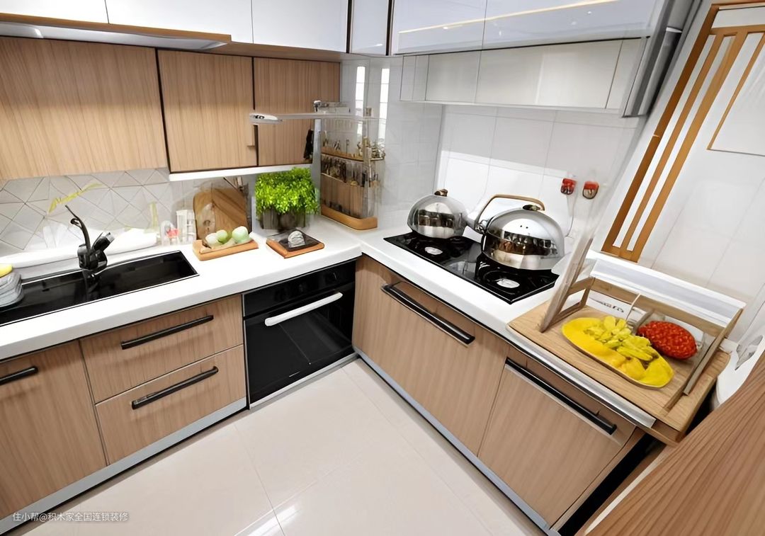 采用木质橱柜搭配白色台面。厨具包括了烤箱、炉灶和洗碗机等设备,均被整合到柜体里,保持整体视觉上的整洁统一。除了基本功能外,这个厨房还有一些特别之处。例如,水槽下方安装了垃圾处理器以便于处理食物残渣;上方则设置了多个储物格来分类存放物品。此外还有专门放置砧板的位置并配备了刀具收纳盒方便取用。 为了增加实用性与美观度,设计师还在操作台上摆放了一些绿植作为点缀品。同时考虑到烹饪时可能需要额外的工作区域进行切菜或备餐等活动,因此预留了一块可折叠延伸的部分供使用。当不需要扩展桌面面积时能够收起恢复原状。总的来说这是一个既注重实用又兼顾美感的空间设计方案。通过合理布局及巧妙细节设计实现了功能性与审美价值之间的平衡。