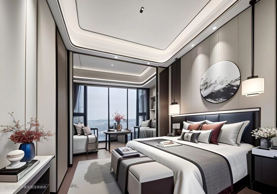 这是一个新中式卧室的场景。装修风格融合了传统中式元素和个人化设计,家具线条简单,艺术作品上展现着自然图案,大量运用木材材料,营造出温馨舒适的居住氛围。这个空间既尊重传统文化,又追求现代生活的便利性。