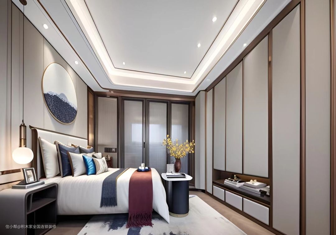 本案呈现了一个优雅而舒适的新中式卧室空间。在色彩上,主要采用了米白、浅灰和木纹色调,这种温和且高雅的配色方案赋予了室内平静而宜人的气息。墙壁覆盖着简洁平整的护墙板,其独特的纹理质感增加了立体感和深度。两边设有黑色边框的玻璃推拉门衣柜,保证了衣物存储的需求而又不会影响空间通透感。 床侧一面长长的矮柜一直延续至窗户下,形成了一个宽敞的梳妆台兼书桌的功能区。这里可以满足日常化妆打扮或是工作学习的需求。同时,靠近窗口的位置也能享受到充足的自然光线。地板选用了暖色调的木地板,它的天然质地为空间增添了温润的感觉。地毯选择了一款带有中国传统图案的款式,在柔和灯光照射下显得更加华丽而不失古朴韵味。整个房间的设计体现了新中式风格所倡导的人文关怀和自然和谐共存的理念,旨在创造一个既能满足现代人生活习惯又能传承中华优秀文化精髓的生活空间。