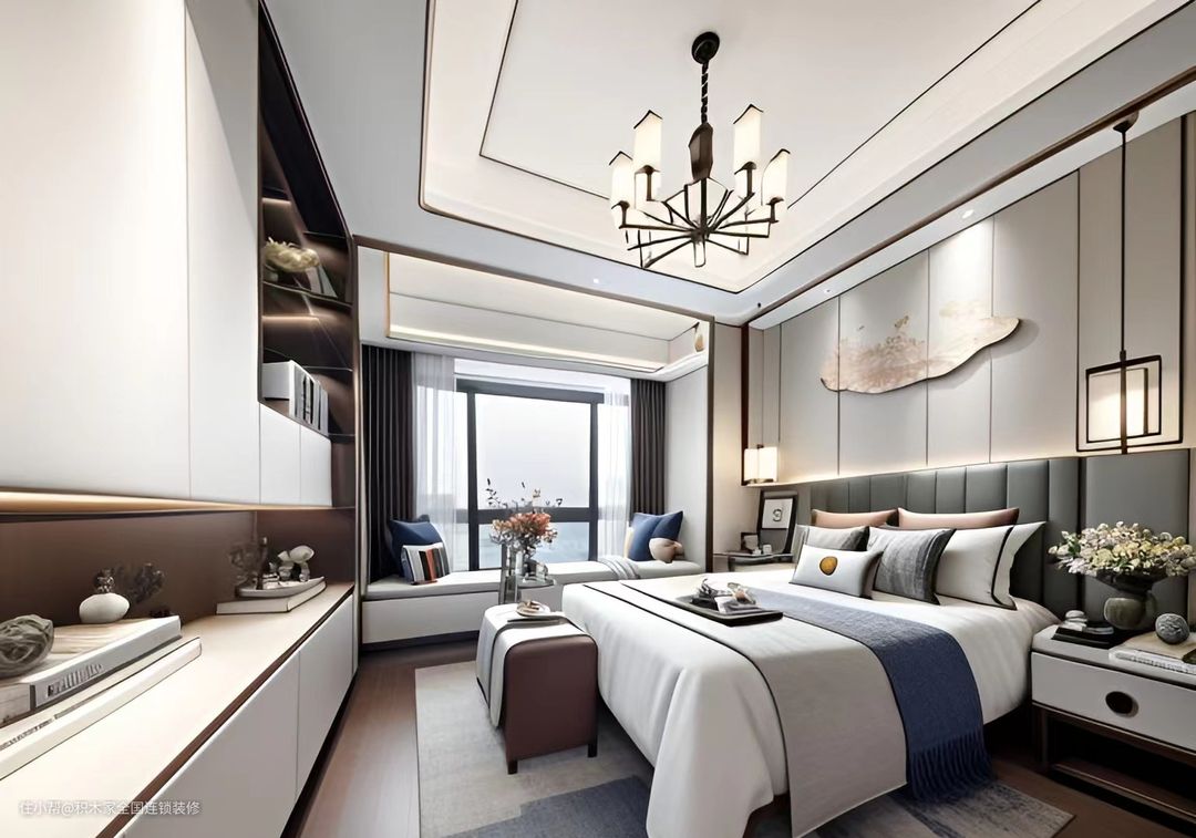 本案例将传统的东方美学融入现代生活,打造出宁静和谐的新中式卧房空间。首先映入眼帘的是精致细腻的墙面造型,利用层次丰富的线条勾勒出极具韵律感的画面,再辅以淡雅素净的颜色,使得整个墙面既有简约时尚的气息又有浓厚的文化底蕴。床头部分选用深色硬包做为背景,并悬挂一副抽象艺术挂画,不仅提升了室内的艺术品位而且增强了空间的整体感觉。两侧各设置了一盏壁灯,它们散发出来的温暖光芒烘托出静谧祥和的气氛,同时也提供了足够的阅读照明。 床的选择遵循了简练大方的原则,柔软舒适的床垫配上纯净无瑕的白色床品套件,让人一眼就能感受到那份安逸与放松。飘窗处充分利用起来打造成休闲角落,摆放一些绿色植物和装饰品让此处成为享受阳光的好去处。整个房间的设计充分考虑到了实际需求和审美的结合,无论是从颜色搭配还是格局规划都能看出设计师对于细节的关注和用心程度。这样的卧室不仅能提供优质的睡眠环境还能让人们在这里找到心灵的归宿,体验一种全新的生活方式。