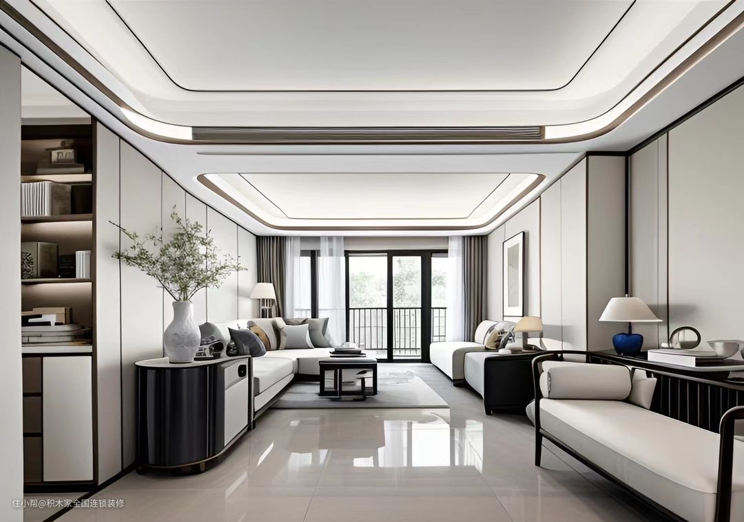 这是一个宽敞明亮的客厅,采用了新中式风格的设计。天花板以独特的曲线设计,配备了嵌入式照明,使整个空间更加明亮。墙壁以白色为主色调,搭配一些黑色和灰色元素,营造出简洁而高雅的氛围。 家具布置得非常优雅且舒适。一张大型L形沙发占据了主要位置,上面摆放着各种色彩柔和的抱枕,为客人提供舒适的休息空间。旁边摆放着一张单人扶手椅和一个小茶几,方便享用茶点。地板采用光滑的瓷砖材质,在灯光的照射下反射出淡淡的光泽,增添了整个房间的典雅气息。 在右侧墙上挂着一幅装饰画,为客厅增添了艺术气息。左侧则是一排书架,上面摆满了书籍和其他小物件,花瓶等,展示了主人的品味和爱好。窗户旁放置了窗帘,可以根据需要调节光线的进入,使室内光线更加柔和。整个客厅给人一种简洁而高雅的感觉,让人感到舒适宜人。