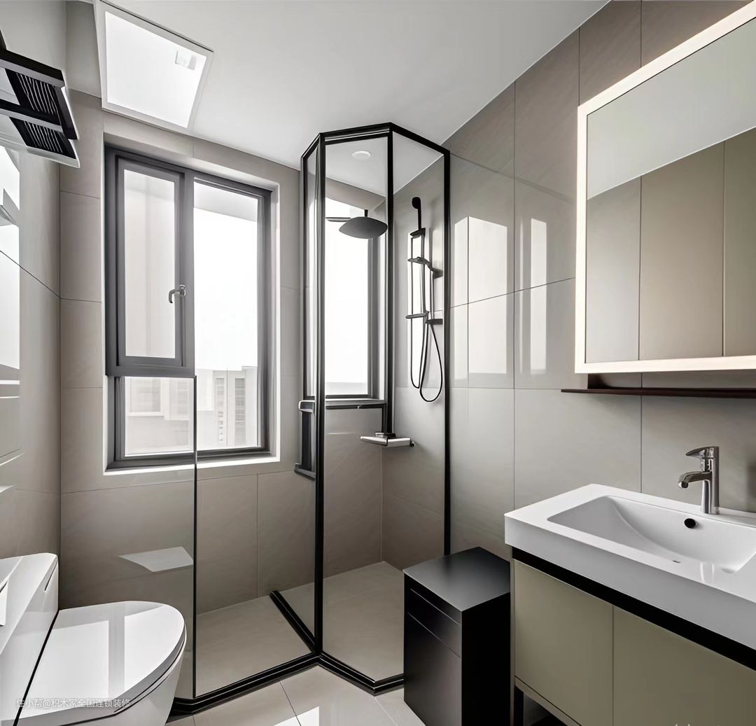 整体采用灰色调瓷砖铺设地面及淋浴隔断,呈现出干净整洁的空间感受。马桶区域被巧妙地隐藏在一个小凹角里,既节省了空间又保持了视觉上的清爽。洗手盆上方安装了一面带LED灯条的镜子,除了基本的反射功能外还具备一定的照明效果,方便使用时查看自己的仪容仪表。水槽下方配置了一个储物柜,用于存放洗漱用品和其他必需品,确保物品有序收纳并易于取用。 淋浴区内设有一块透明玻璃作为干湿分离屏障,有效防止洗澡过程中产生的水分溅到其他地方,维持卫生间的干燥度。此外,淋浴区的一扇窗户引入自然光照亮内部空间,增加明亮度并且有助于通风换气。该设计方案通过合理布置设施和精选材质来实现美观实用的效果,符合现代都市人群对于高效便捷生活环境的要求。