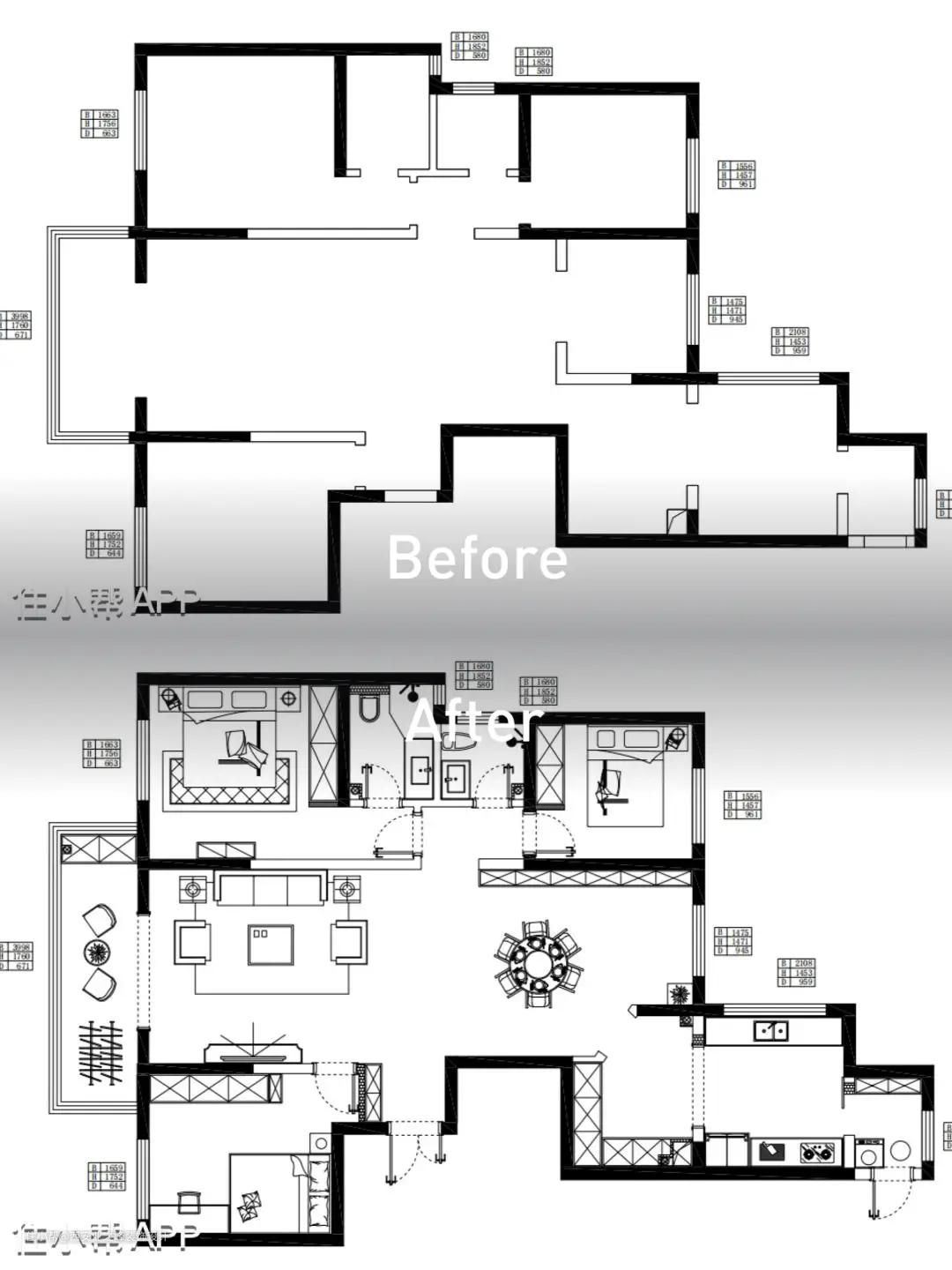 原始户型为四居室,但是相对餐厅来说就比较尴尬,所以设计师将最小的卧室直接打通,改造成餐厅,客餐厅立马视觉上大气显空间。