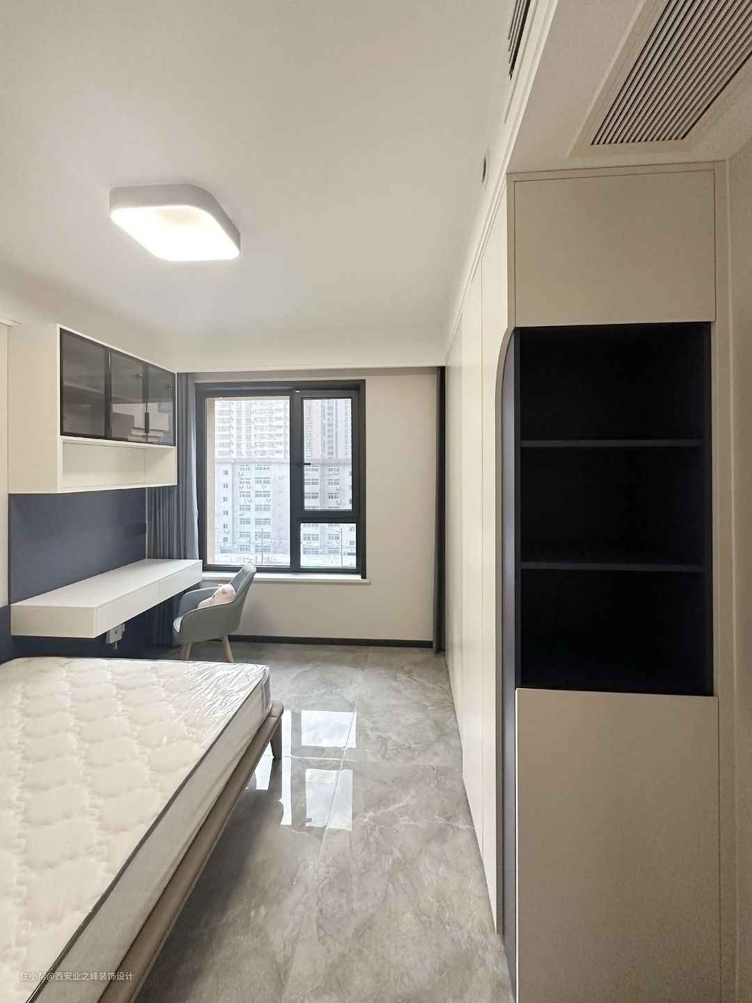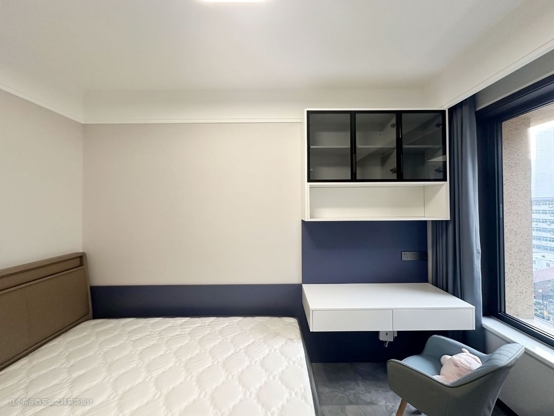 次卧做了悬浮书桌,作为儿童房更为合适,集学习阅读与起居一体,整体空间走的是现代简约风格。