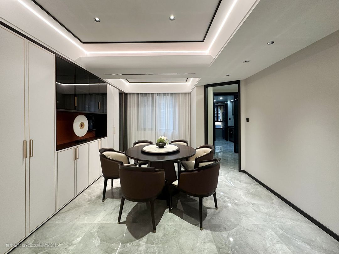 餐厅主要做了无主灯设计,通过木条点缀的顶面更为有特点,搭配简约的餐边柜,简单且时尚。