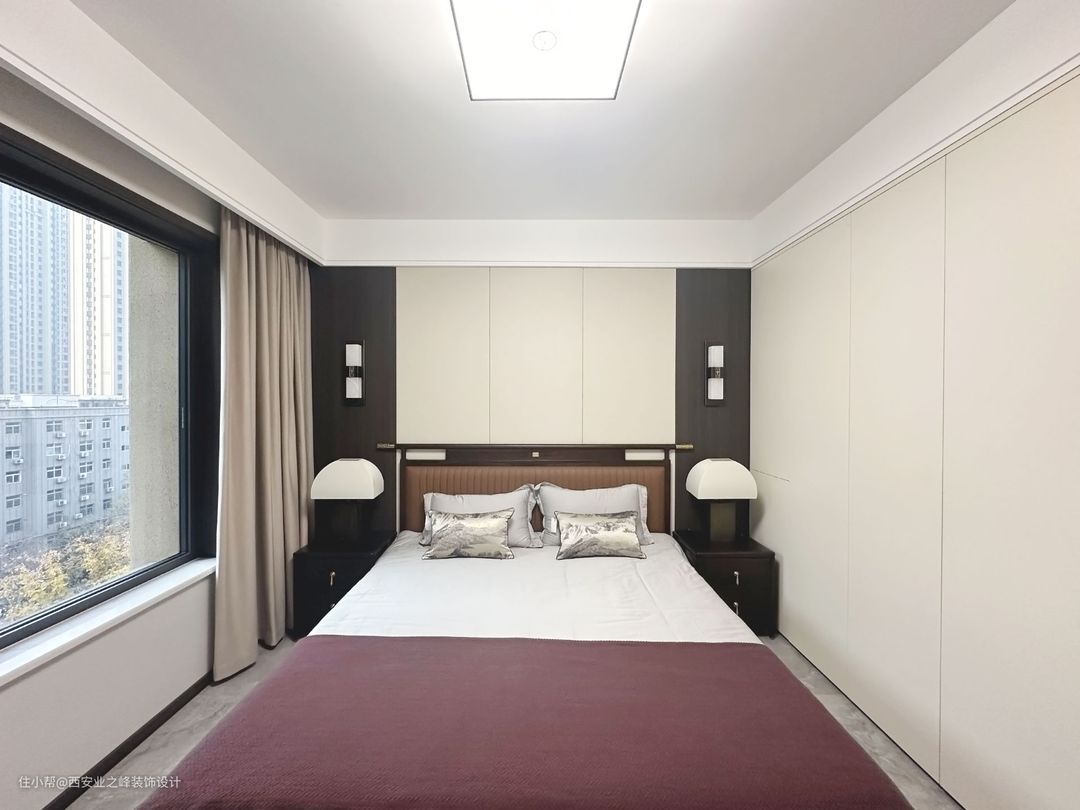 主卧设计的更为简洁大方,双眼皮吊顶搭配床头硬包,在增添中式的壁灯,整体凸显出了新中式的灵魂。