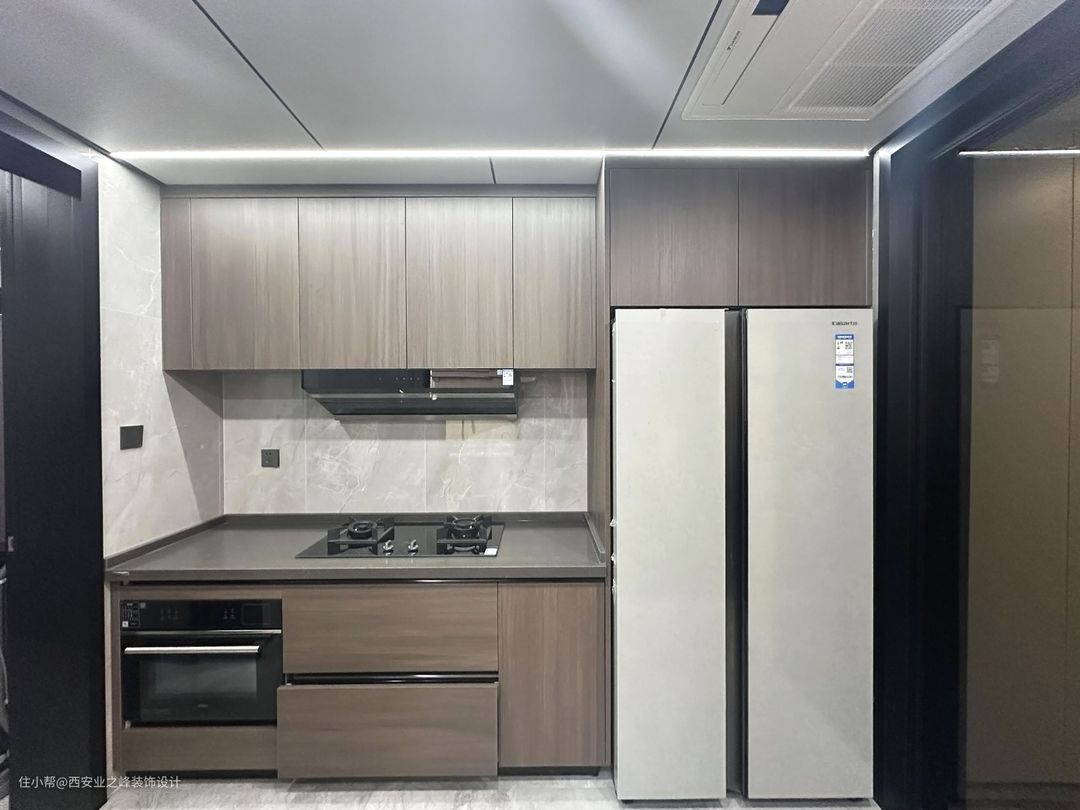 厨房顶面采用了蜂窝大板和线条灯的装饰,目前属于比较前卫的吊顶方式,搭配与主色调一致的木质板材,让空间统一大气。