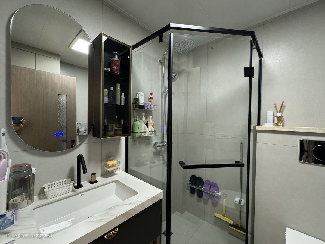 卫生间选用了浅色瓷砖,区分与整体地面瓷砖颜色,简单时尚,墙面更是做了大砖上墙,钻石淋浴区,整体为简约时尚风。