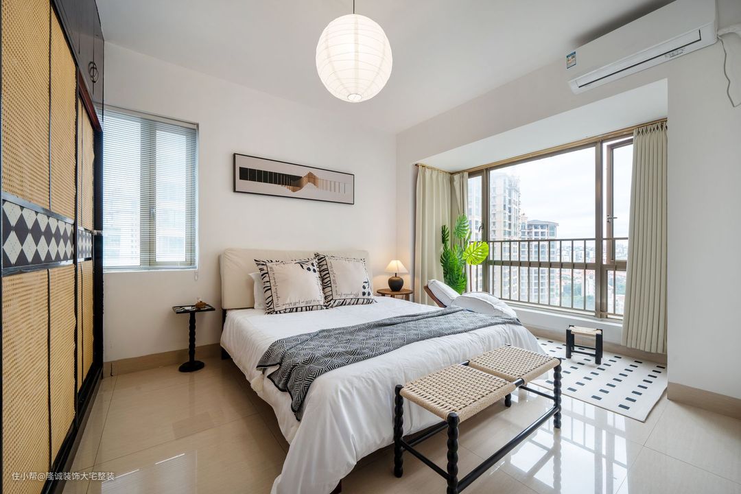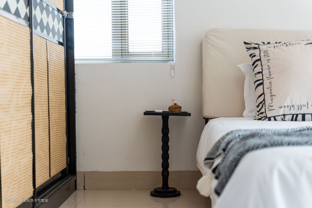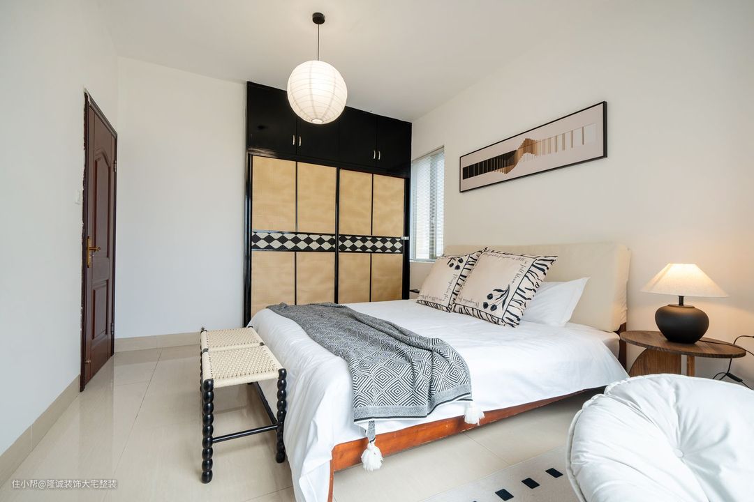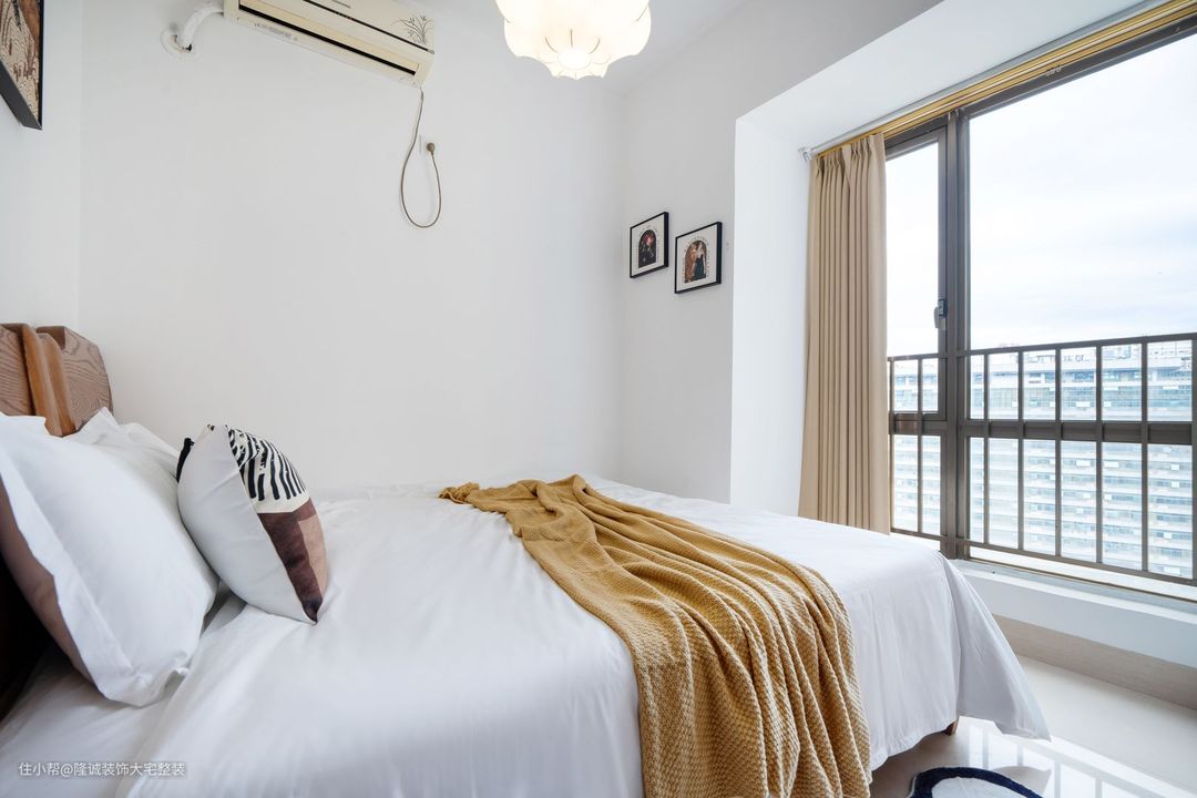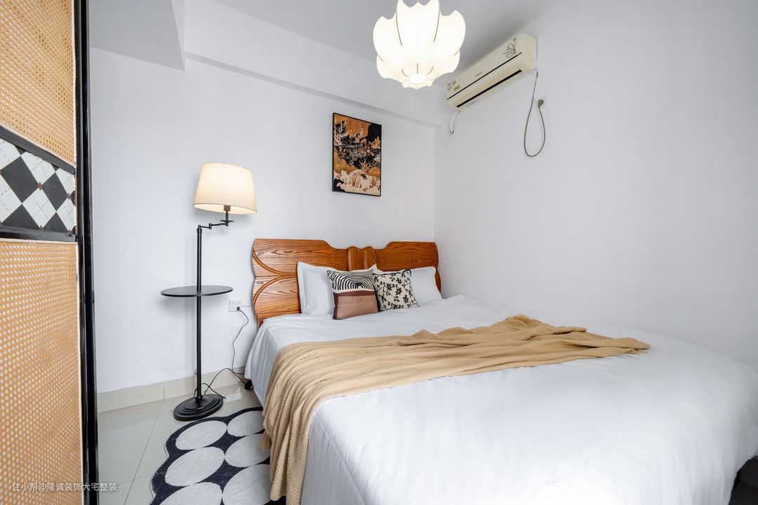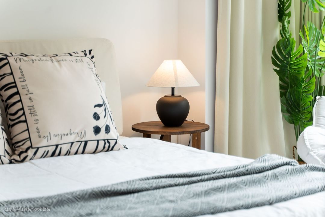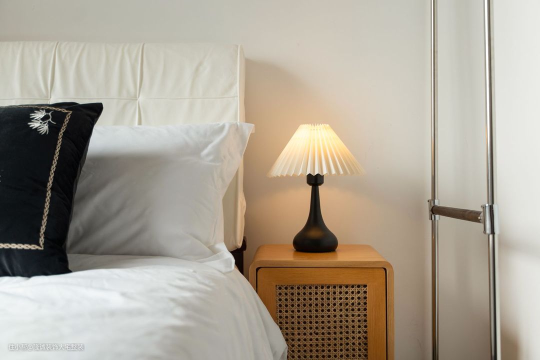 次卧的设计相对于来说更加偏向北欧奶油风,浅色系床品的配色搭配网红球形花朵吊灯,床头搭配复古式床头柜,让视觉的撞色感更加强烈,整体又不失小清新的感觉