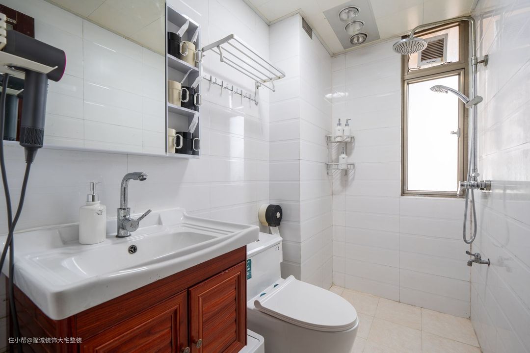 卫生间柜体采用美式复古棕色,搭配大面积奶油白,镜柜的设计可以很好起到收纳作用,整体干净清新又自然