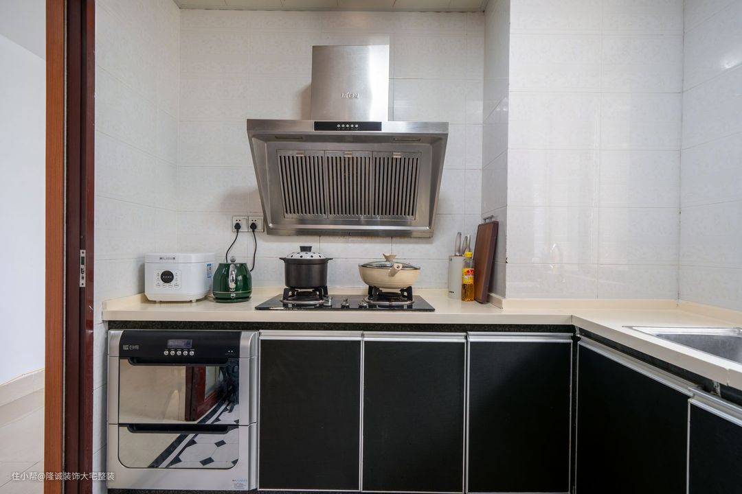 厨房的设计对于一个不做饭的人来说,也需要功能齐全,简约但不简单,黑色永远是高级配色之一,搭配大理石岩板的地柜,显示丰富的层次感