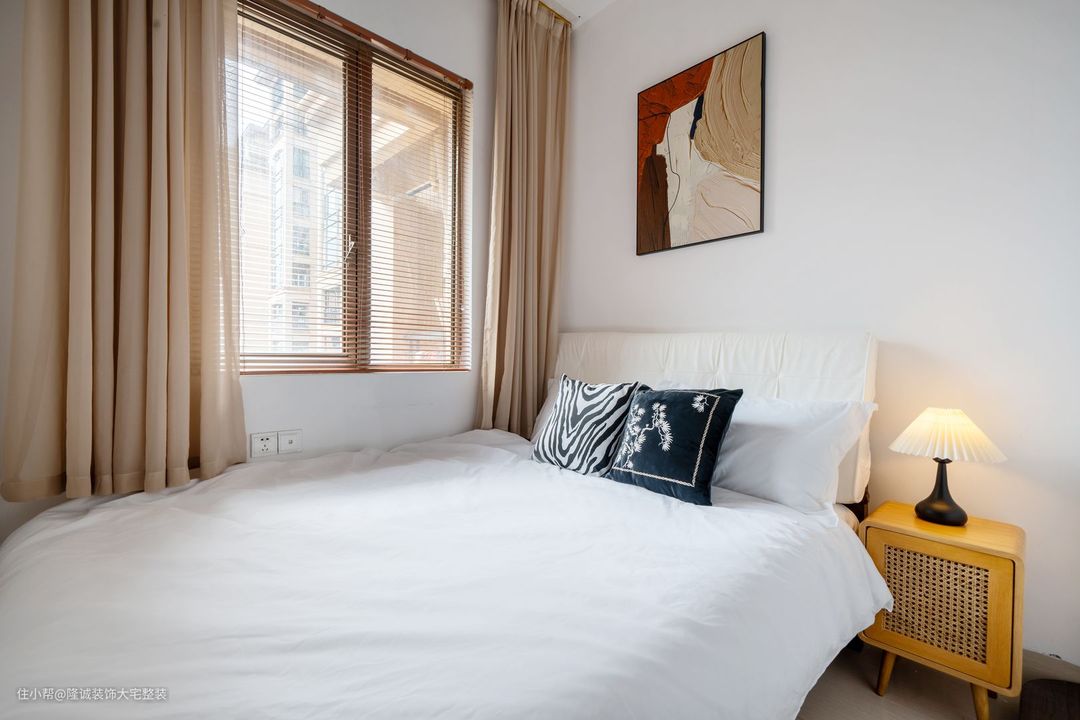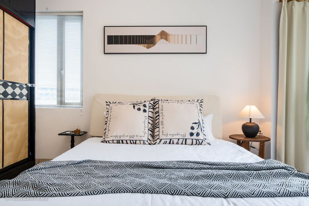 床头选择了简约式木制床头柜,搭配浅色床品和牛油果绿色窗帘,营造出温馨浪漫的氛围。 墙壁上挂一些复古的画作和照片墙,比如黑白照片等,为空间增添怀旧的情绪。