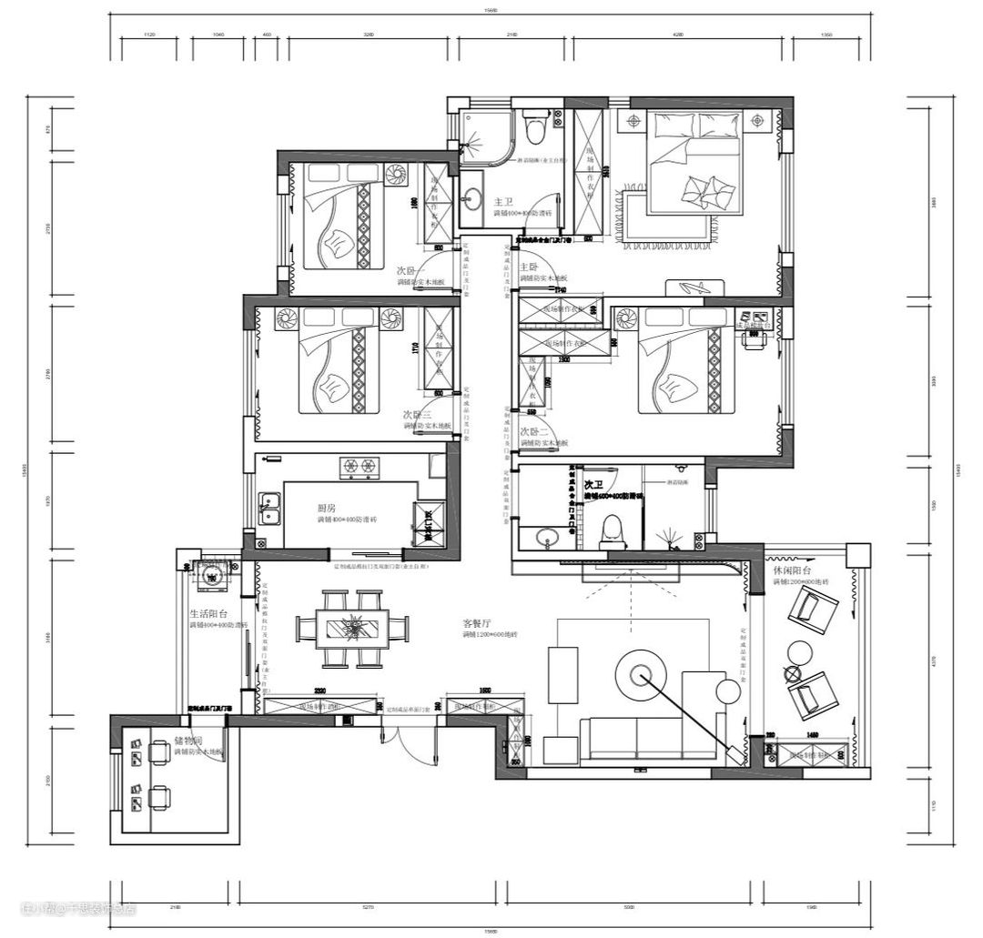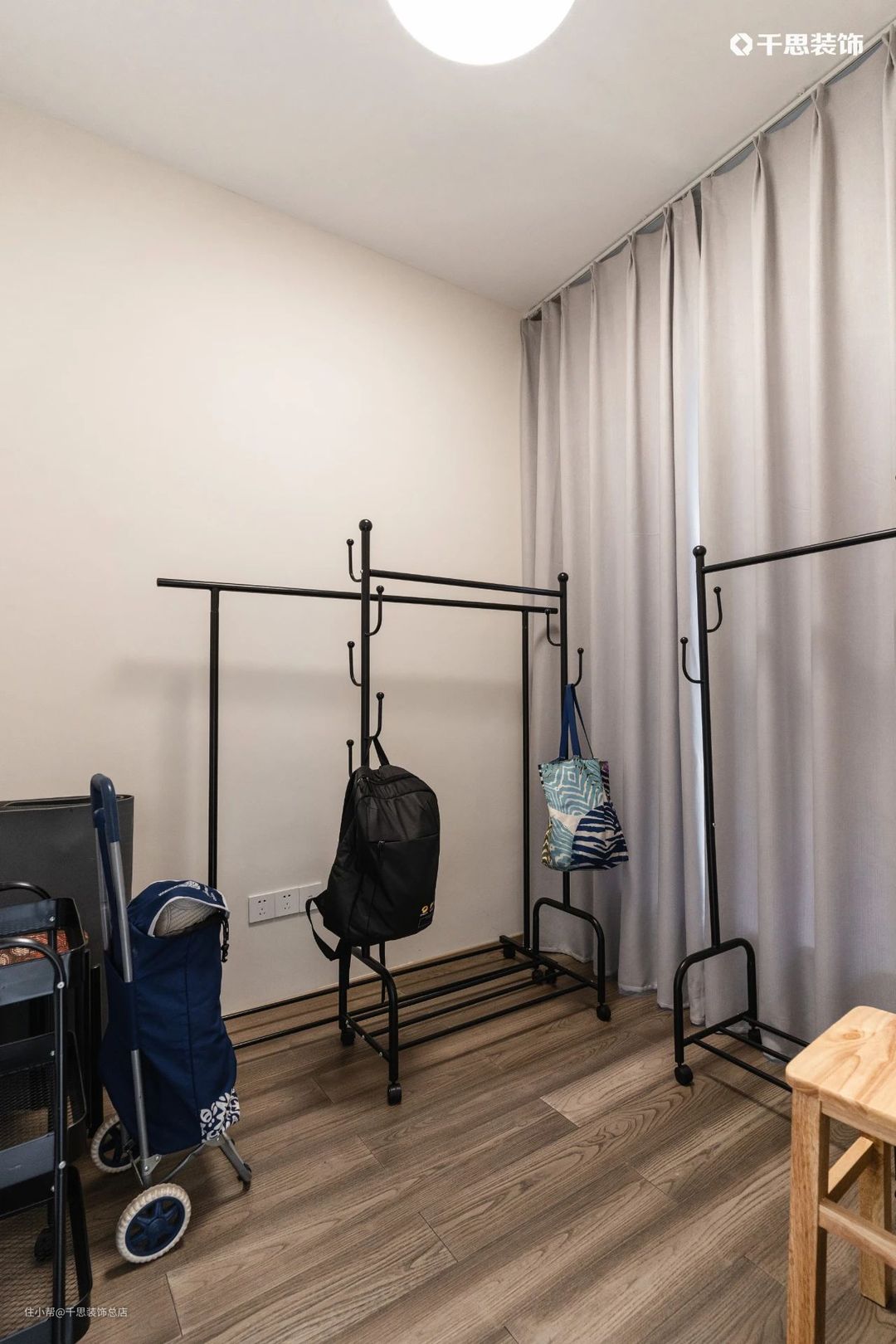 将生活阳台旁侧的保姆房改为储物间,挂架灵活收纳,后续也可以看体量来配置新的储物家具。