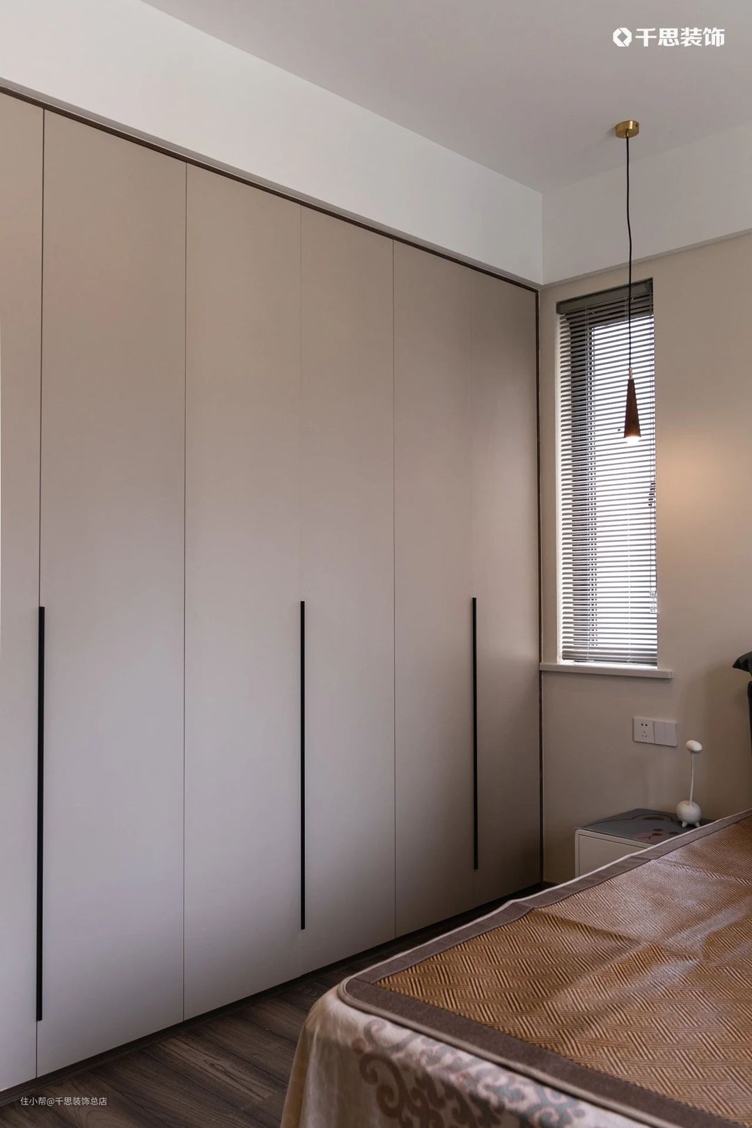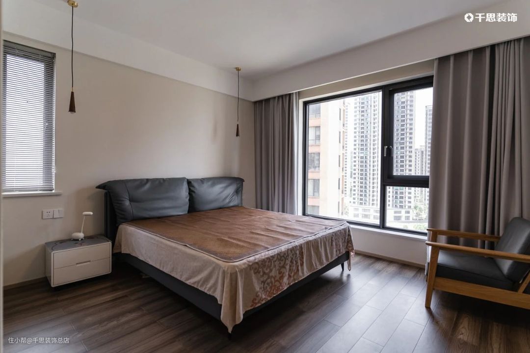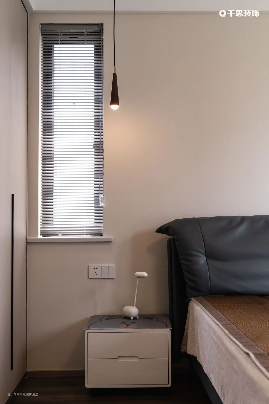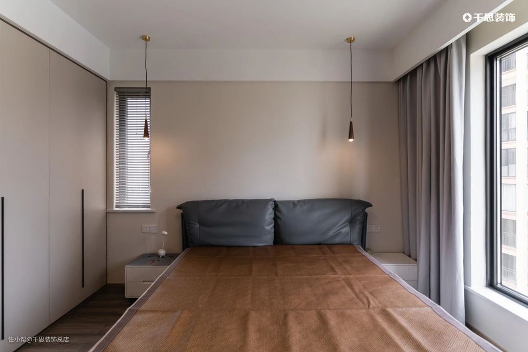 主卧同样以奶咖为主色调,保留的小窗上装饰着百叶帘,在小巧的吊灯下呈现温馨氛围。