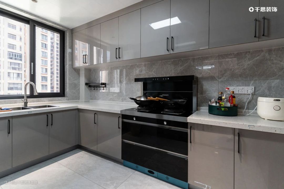 厨房内部,宽敞的U型操作台+上下橱柜,可容纳多人下厨,大体量收纳米面粮油也不在话下。