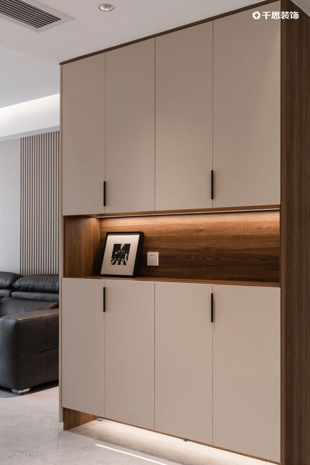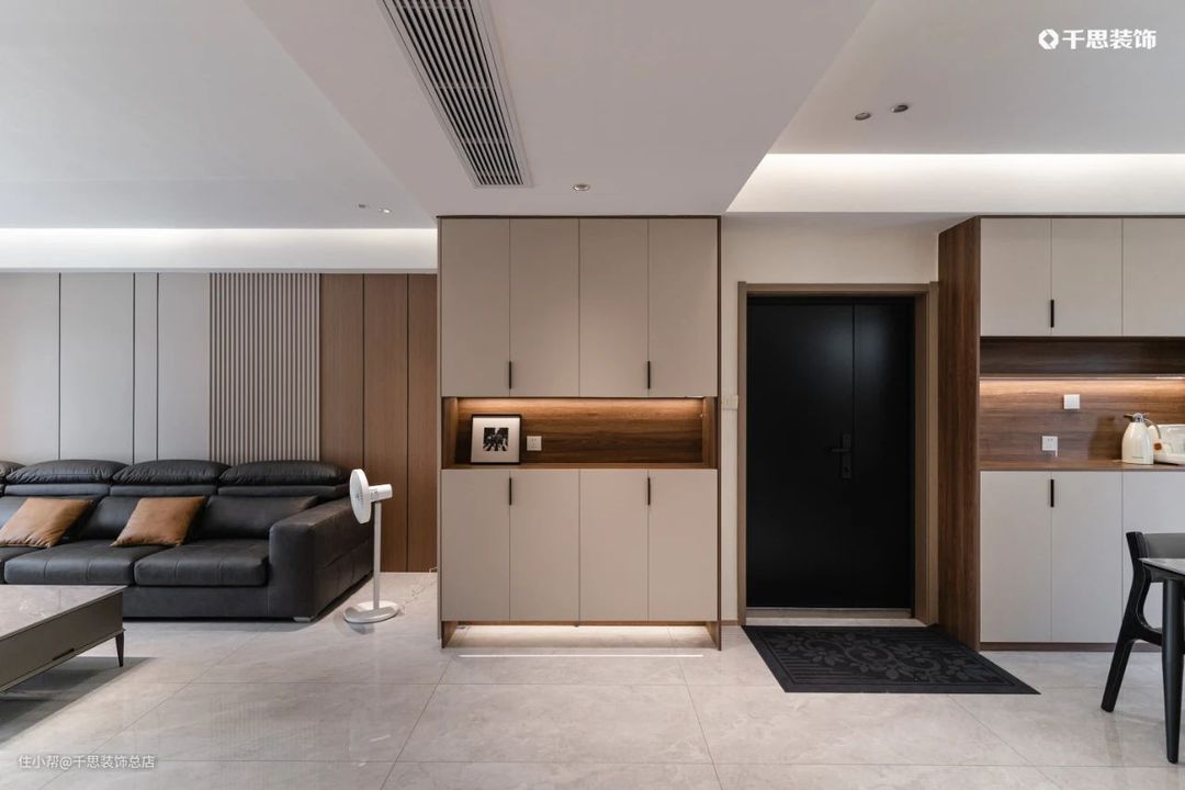 入户门两侧,鞋柜+餐边柜组成整面玄关收纳,利落实用,大气范儿尽显;镂空处嵌入灯带,换鞋、放包都很方便。