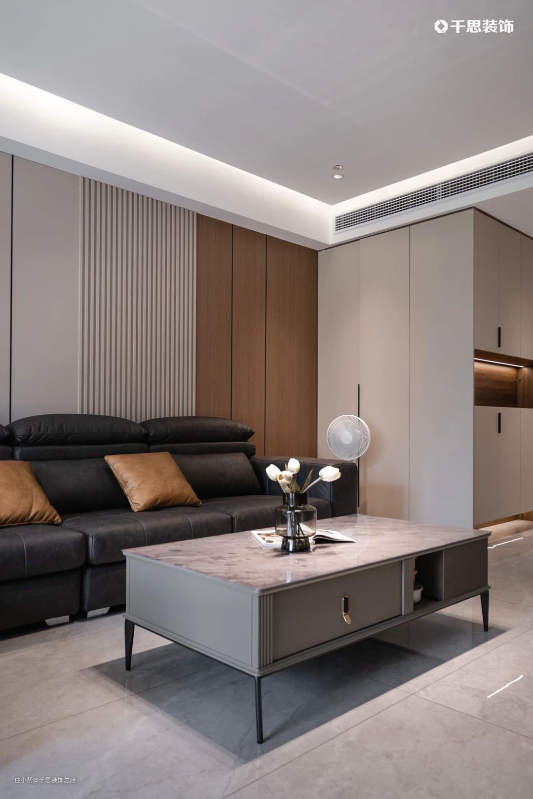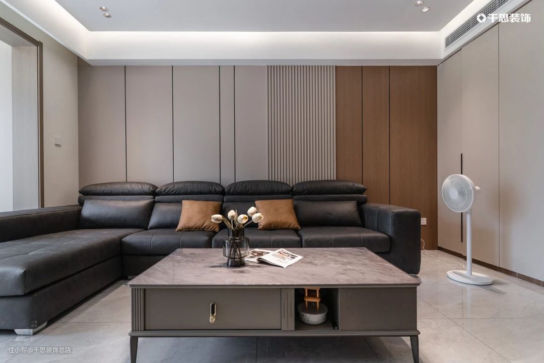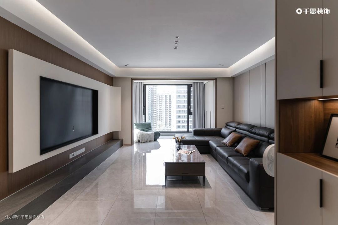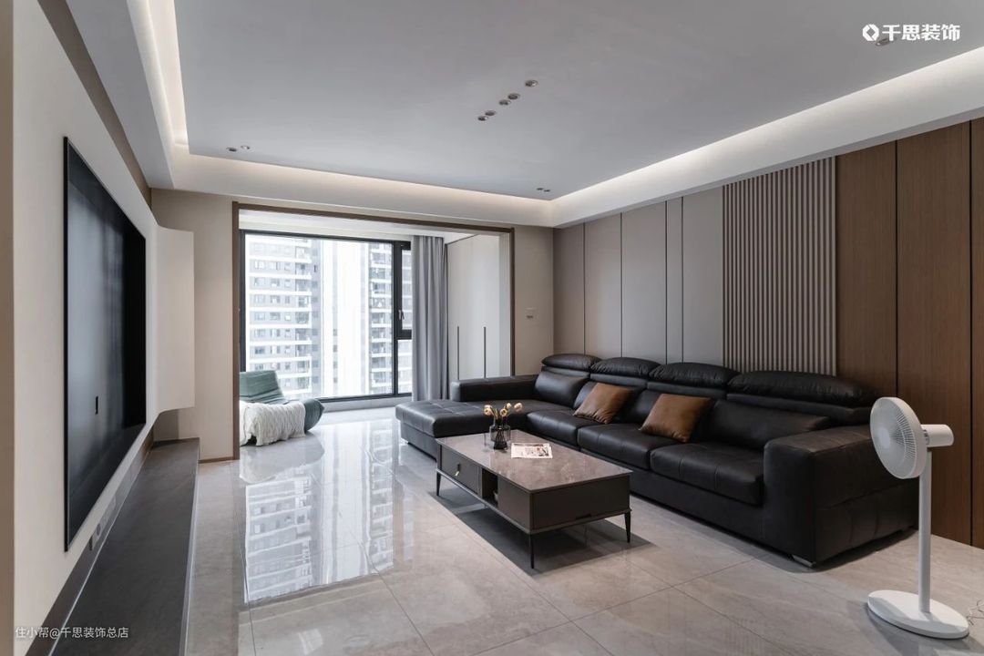 以木饰面硬包的沙发背景墙,通过摩卡清灰+原木色调烘托清雅质感;长约4.4m的电视墙,在木饰面上做“白月光”石膏板内嵌电视,搭配极简地台,层次分明,清爽流畅;可坐可躺的贵妃位沙发,雍容华贵,是最惬意的休闲一角。