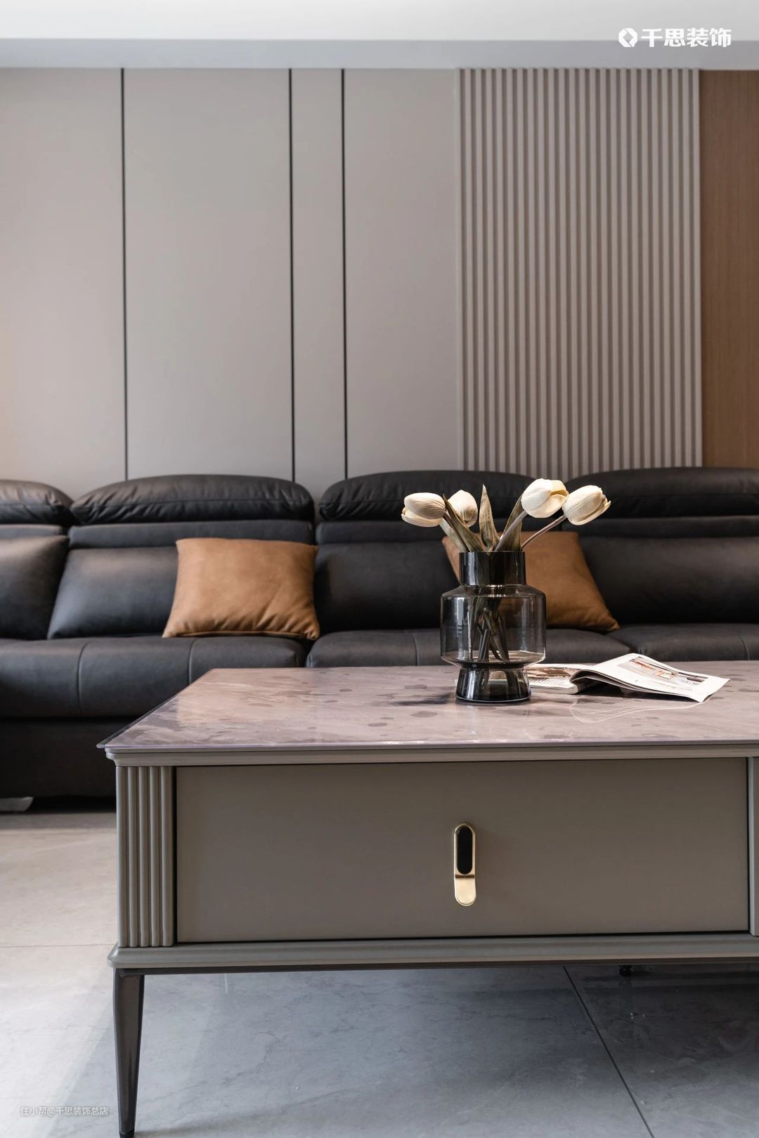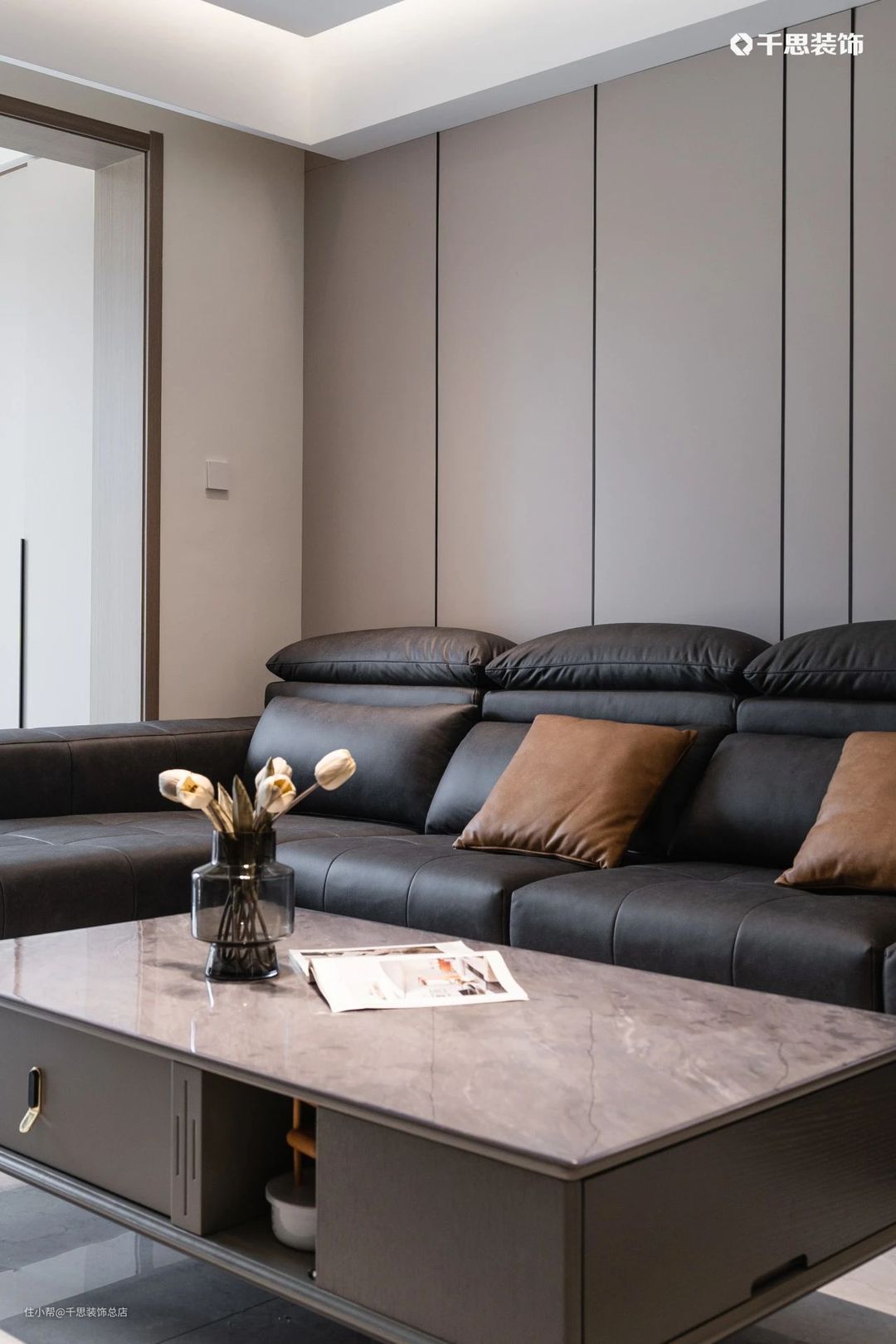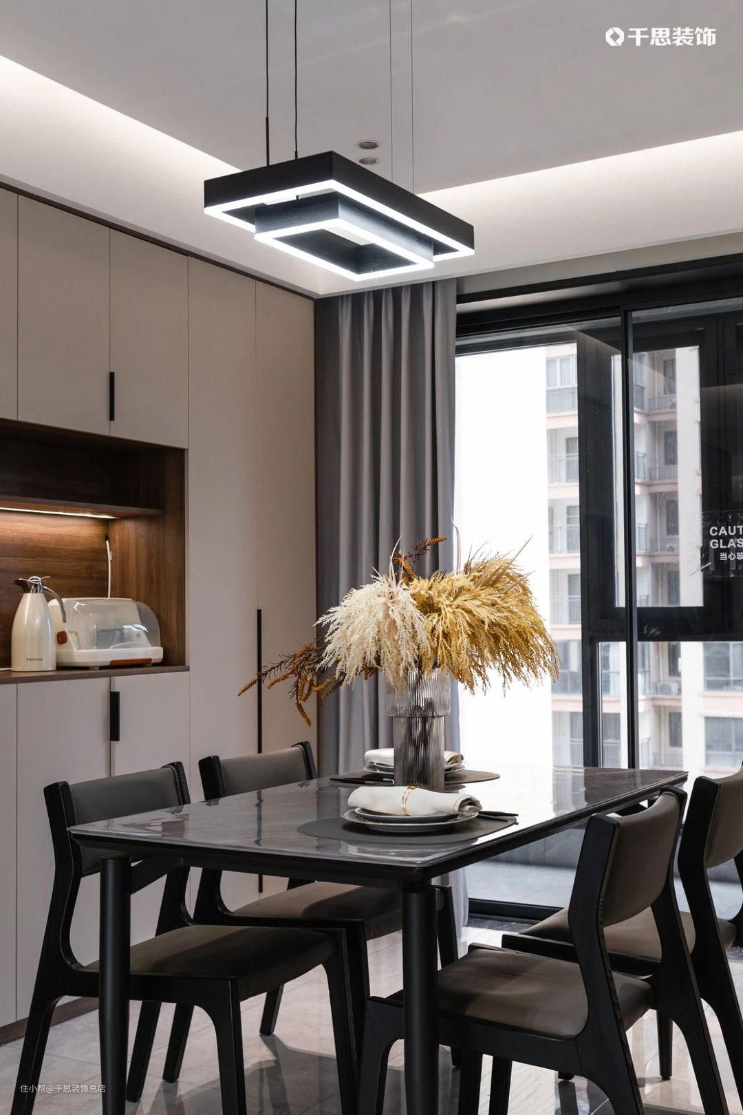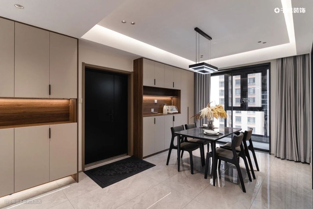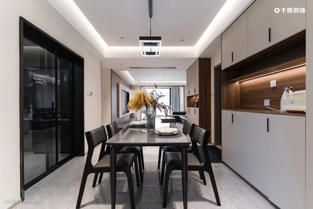 雅致的黑灰调岩板餐桌,配合同色系餐椅简约时尚,拉满就餐仪式感;左手边的厨房定制黑玻推拉门与餐厅隔断,低透明度能有效遮挡烹饪后的“战场”。