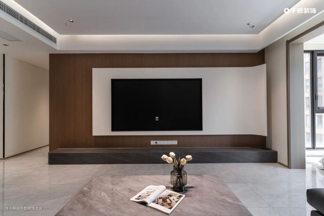 设计亮点: 1.长约4.4m的电视墙,在木饰面上做“白月光”石膏板内嵌电视,搭配极简地台,视觉效果大气流畅; 2.主卫淋浴区用玻璃隔断,既节省空间,又不阻碍光线,实用性拉满。