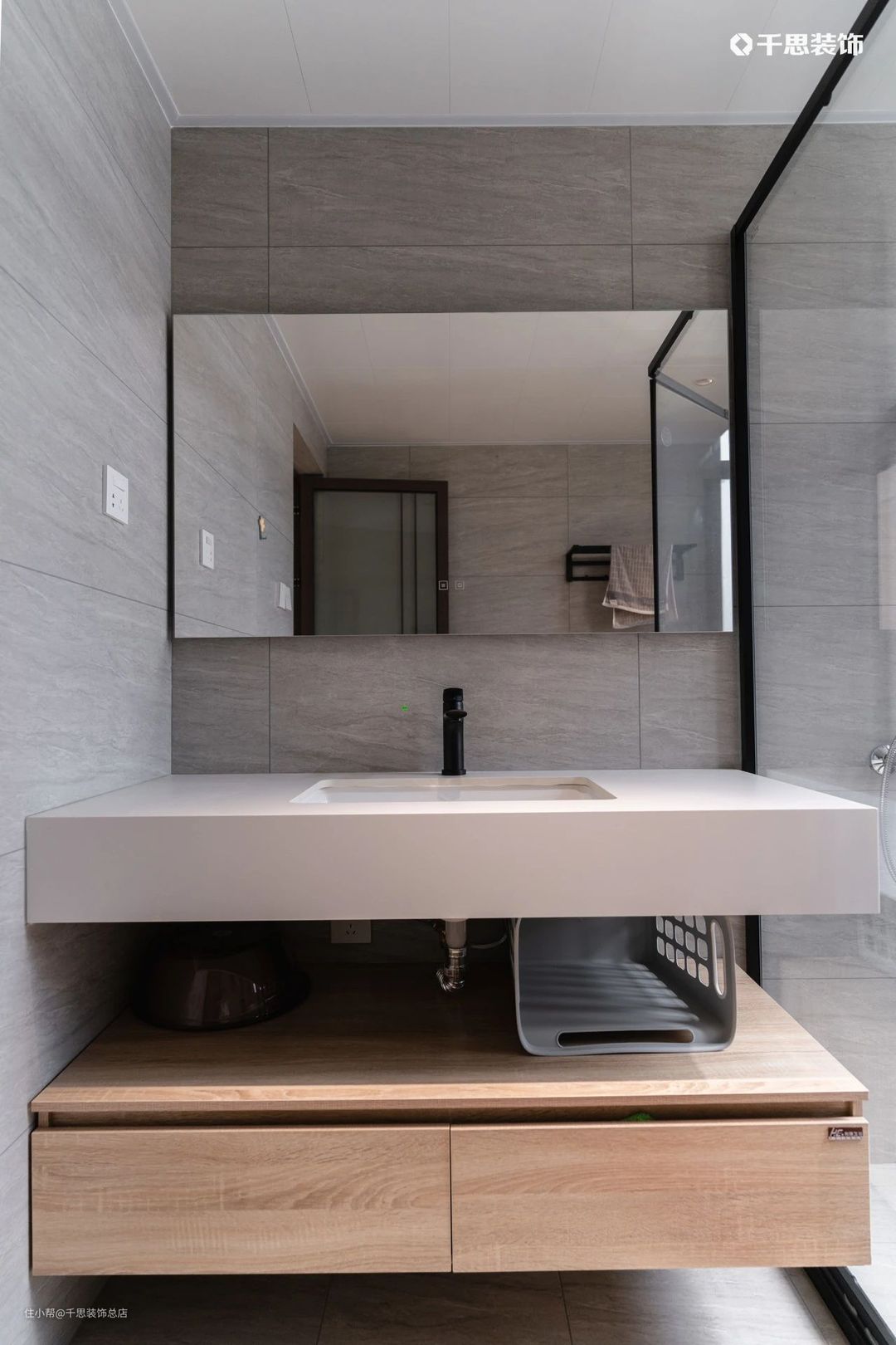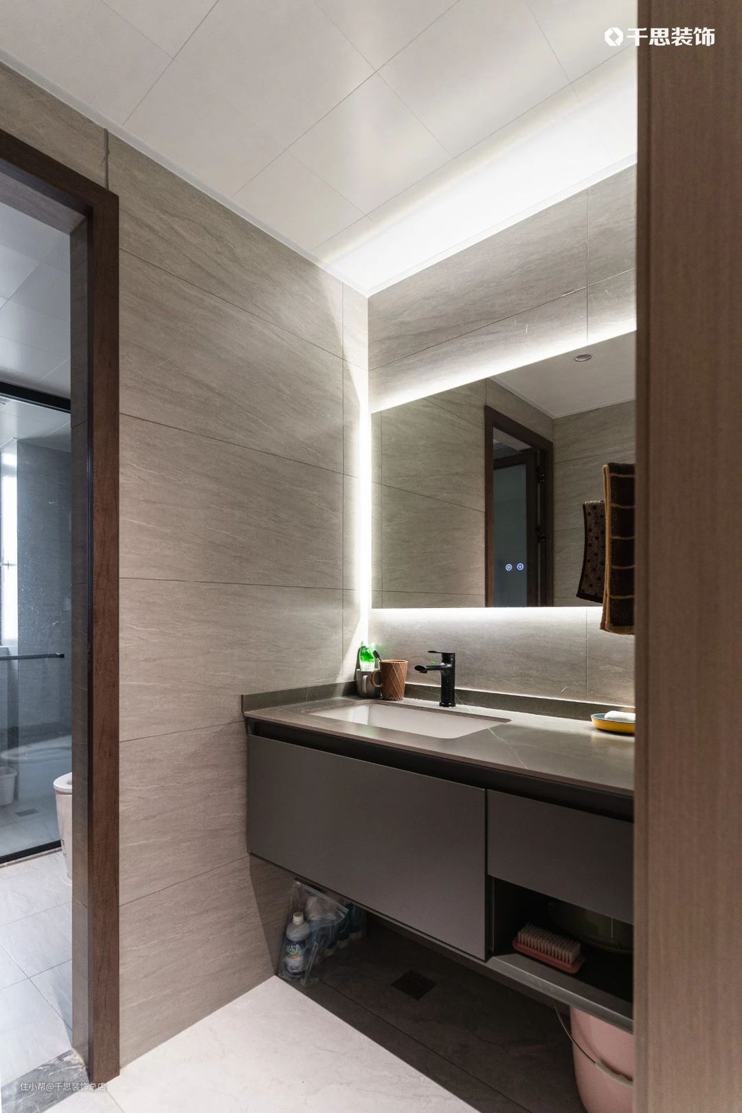 客卫干湿分离,灰色系洗漱台搭配简约镜柜,四周嵌入灯带,使用起来十分便利。
