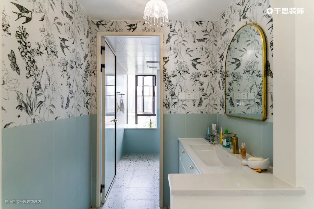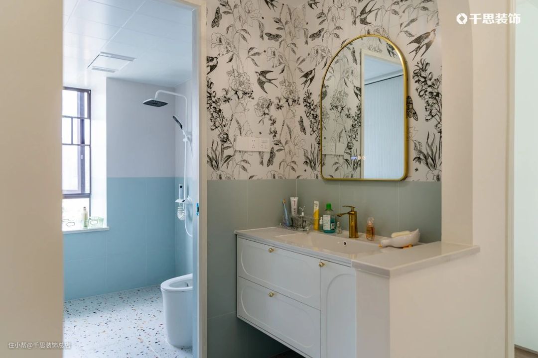 客卫干湿分离,做半墙分色设计+花砖贴片,清爽雾蓝色承接上方的文艺花鸟图案,赋予空间高层次表达;淋浴区做水磨石地面,白色淋浴五金与黄铜边框梳妆镜的搭配,都让客卫的复古范儿无声流露。
