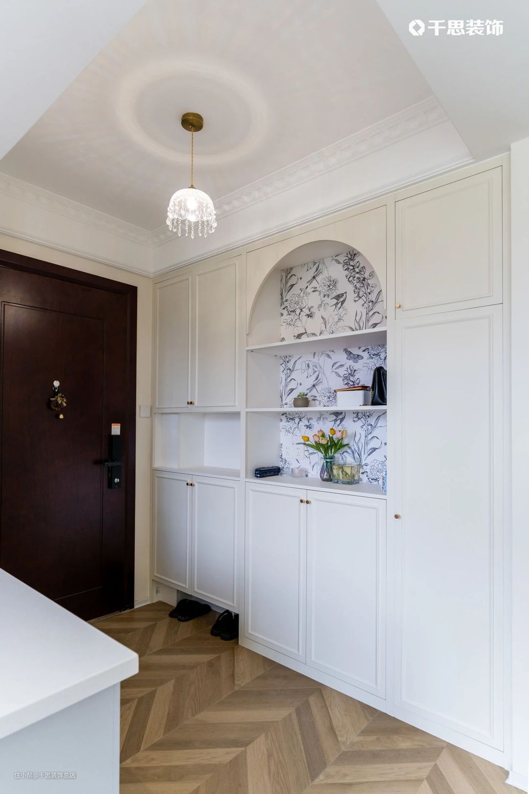玄关区靠墙定制嵌入式组合柜,中部镂空做拱形开放格,内部贴花砖修饰,简约清雅,极具质感。