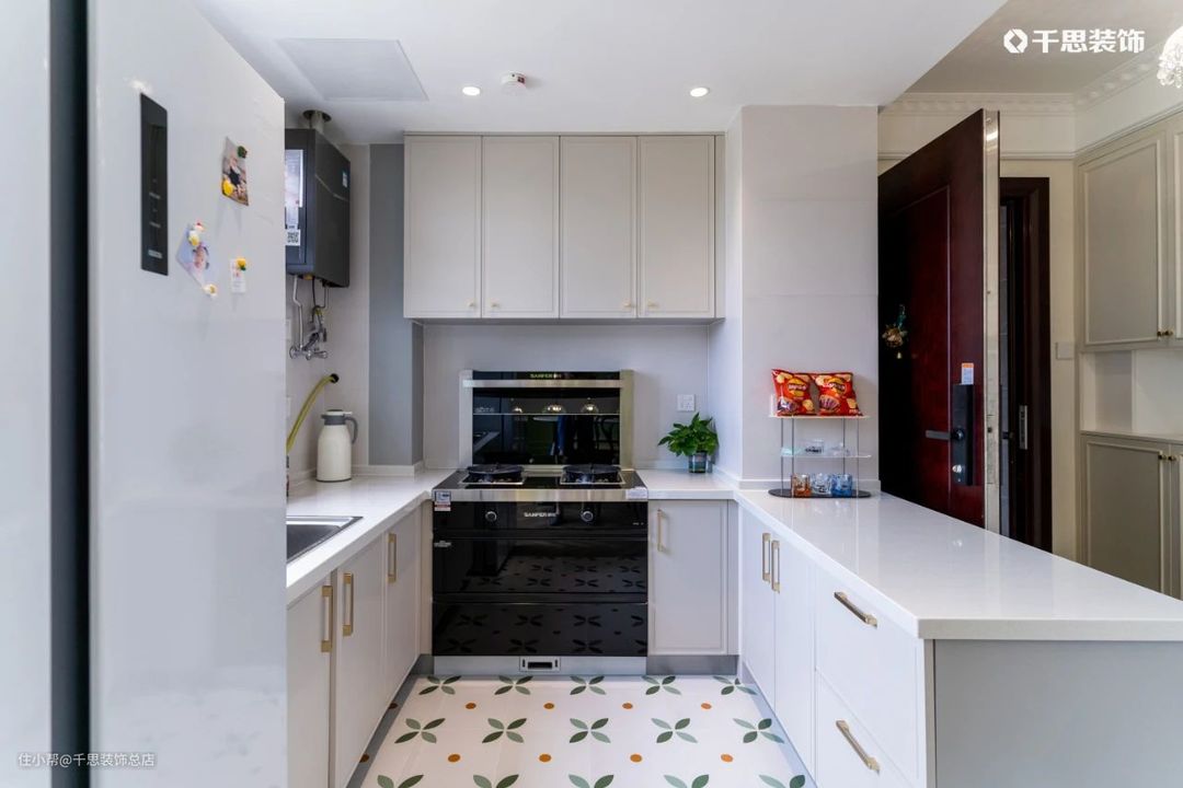 厨房内部,U型橱柜将收纳空间利用到极致;顶部做防水石膏板+无主灯设计,高级感十足;从这个方向看向客厅,无阻碍的空间连贯通透,家居环境浪漫又温馨。