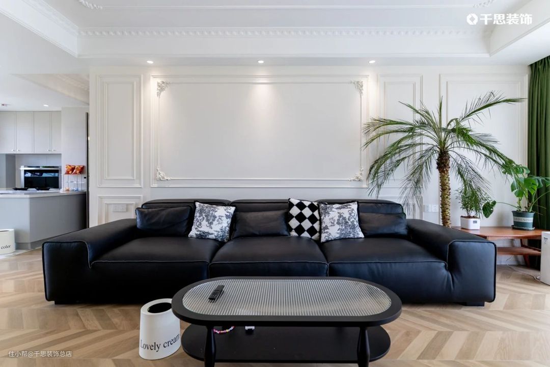 双面背景墙都铺刷都芳1-0301p的经典奶油色乳胶漆,上面点缀pu线条+精美雕花,呈现典雅的法式气息;黑色皮质沙发+弧形双层茶几,自带中古氛围与电影般的深邃质感,让空间拥有视觉重心;生机盎然的高大棕榈葵点缀在侧,黑、白、绿、棕相交映,颇有ins风老洋房的腔调.