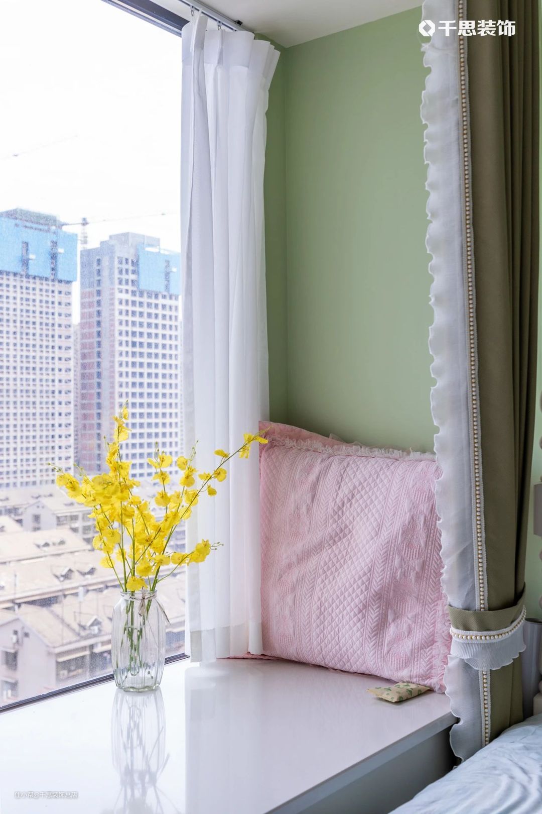 次卧是留给长辈小住的房间,保留飘窗拓展休闲区,牛油果绿背景墙+特色宫廷风床头也别有意趣。