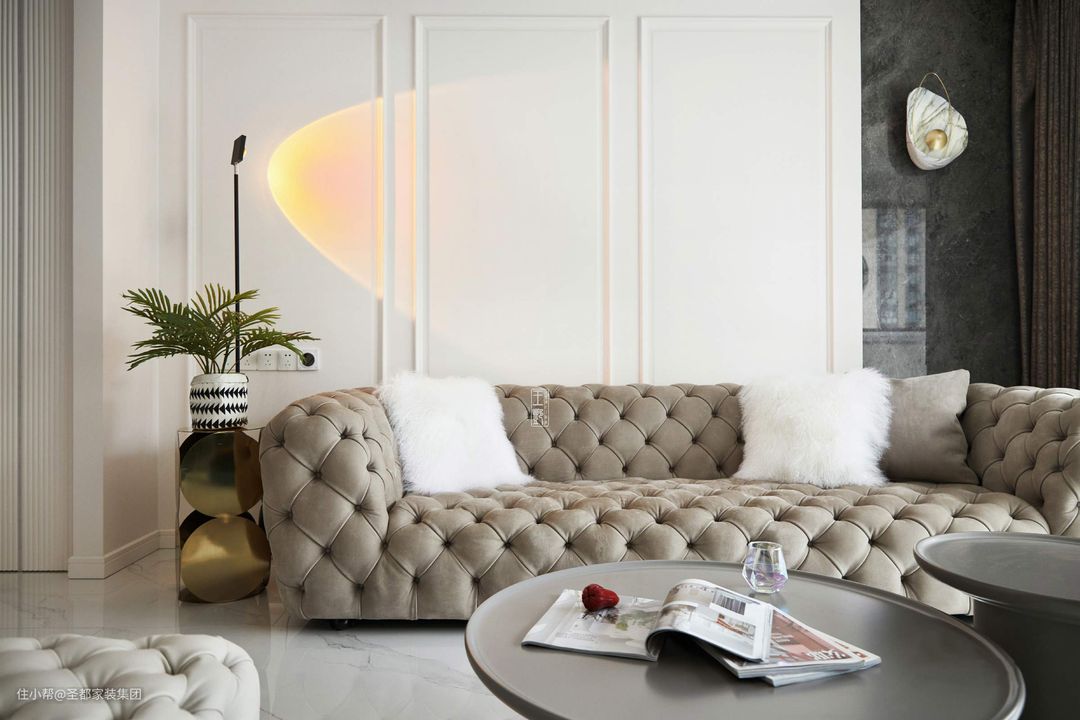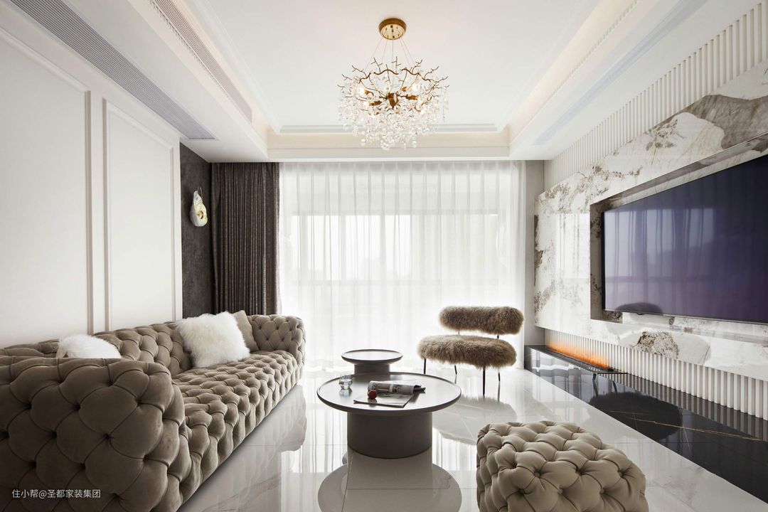 步入客厅,就被扑面而来的古典雅韵与浪漫气息所折服,乍见欢喜,久处亦怦然。磨砂真皮沙发与毛绒单人椅隐匿着一股尊贵与奢华,营造的法式浪漫在不经意间流淌;水晶吊灯梦幻唯美,摇曳出温润如琥珀般的蜜色光华;精致小巧的日照灯划出一道美丽的弧,投射下暖橘的光,让绿植愈加迸发出盎然生机。 都说电视背景墙是客厅的门面担当,此言果然不虚:以大理石为底,嵌入电视,打造轻薄视觉效果;靠近阳台一侧预设了雾化壁炉,既能美化空间,又能起到加湿的作用;次卧的房门与背景墙融为一体,更显简约美。