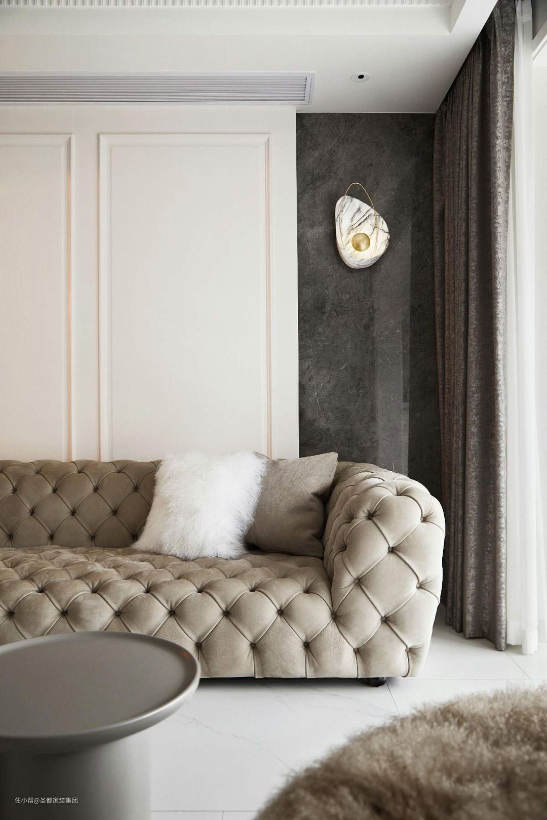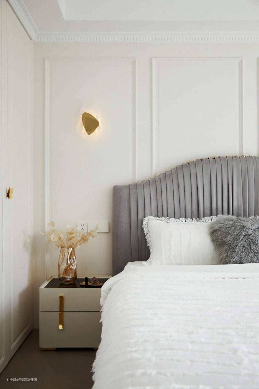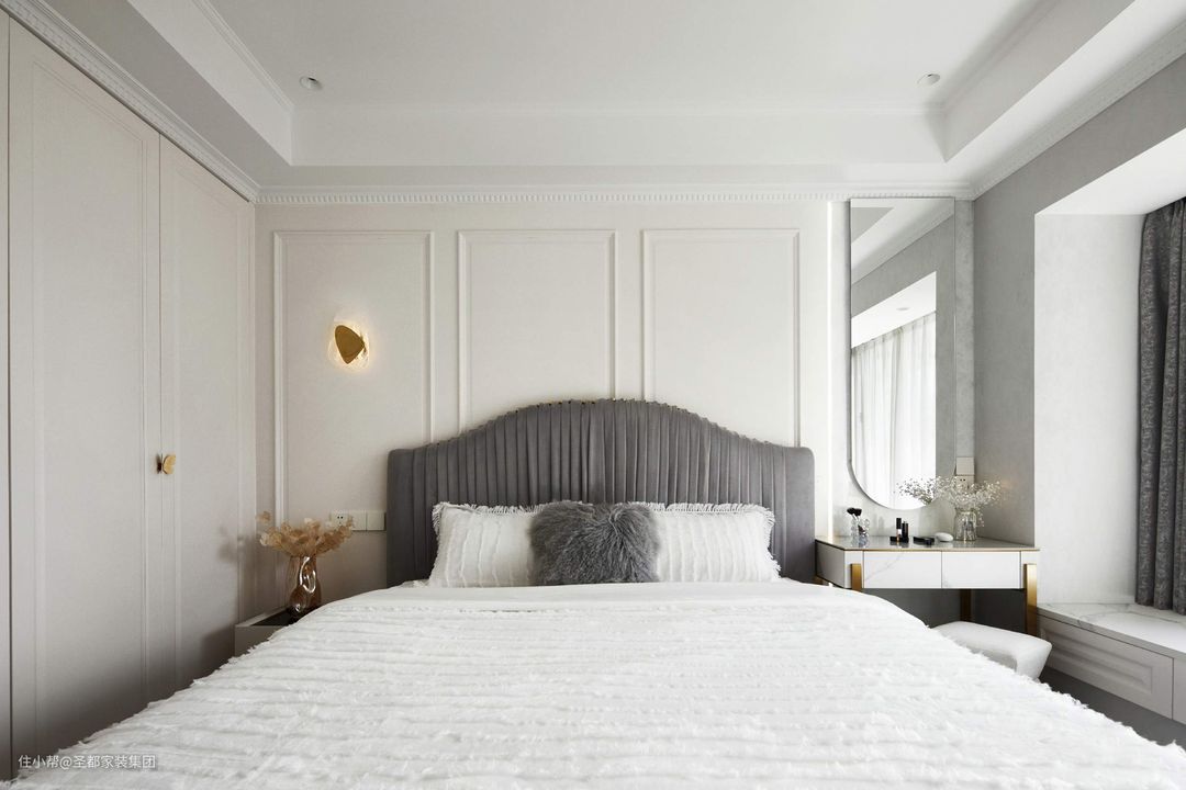 平和温润的空间,用色彩与材质描摹雍容气度,于静默空间里彰显不凡品位。奶油色系里交织着温柔的天鹅绒床品,简练线条的护墙板上镶嵌着典雅的壁灯,乳白衣柜上点缀着精致的蝴蝶拉手,无一不显示了艺术与生活的高度融合。